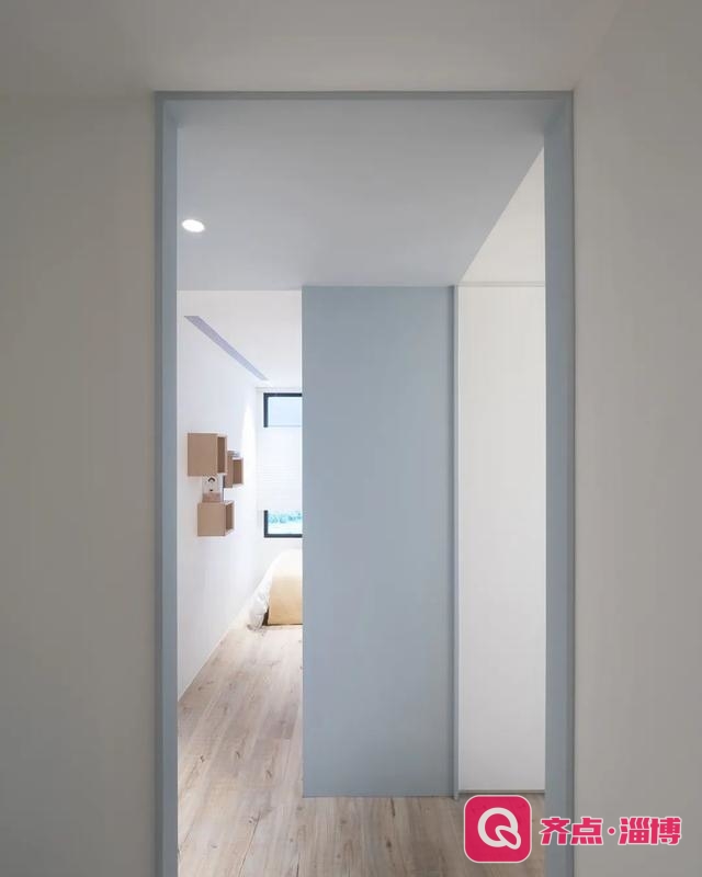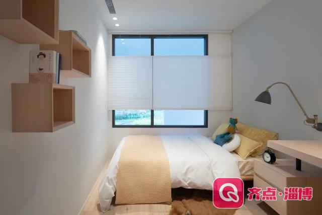 儿童房的色调更显明亮,因为空间不足以做书柜,所以选择在墙面做了几个展格,用来存放孩子的书籍。