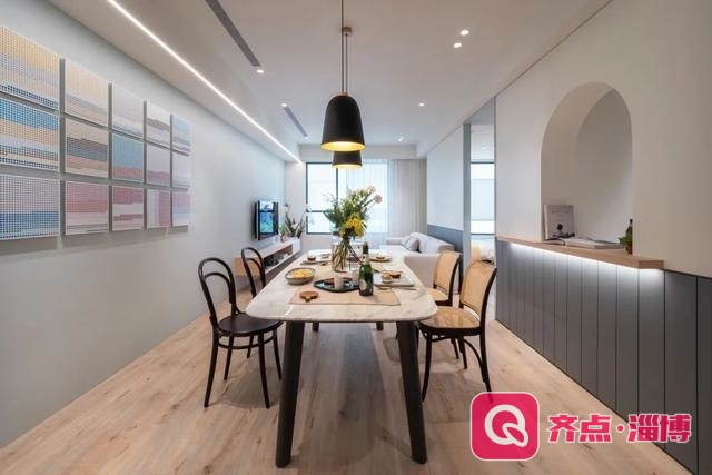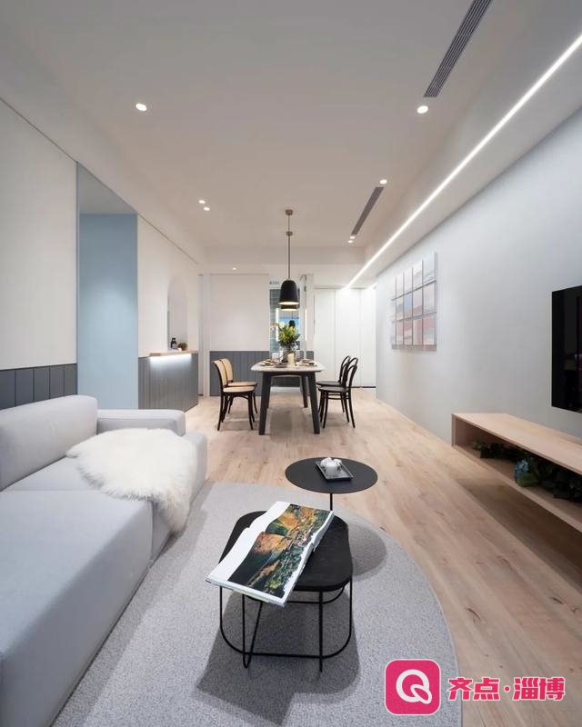 二、贯穿全屋的吊顶灯光,让全屋从客厅到餐厅都十分亮堂。