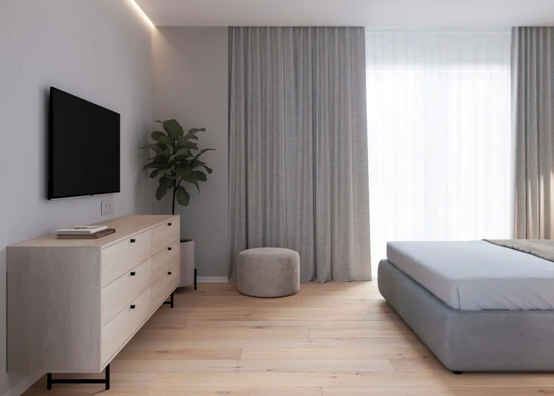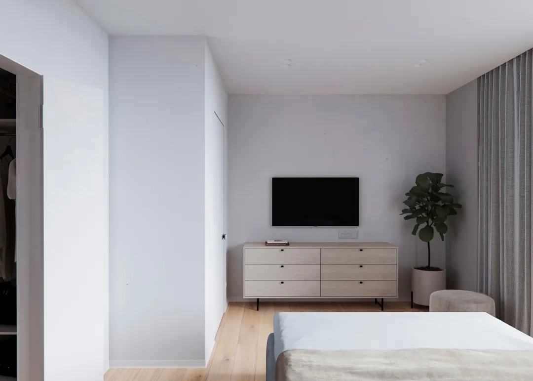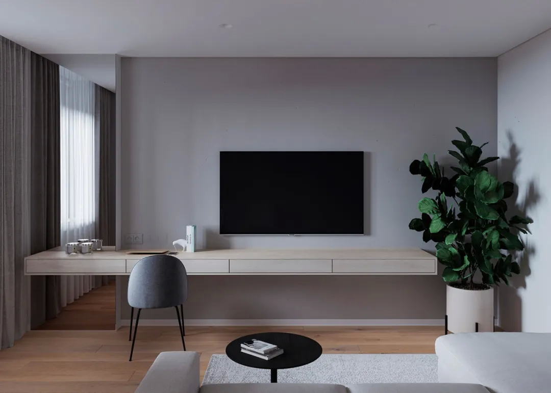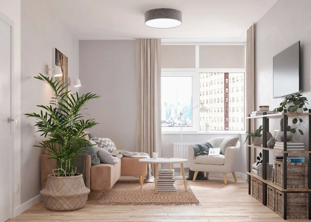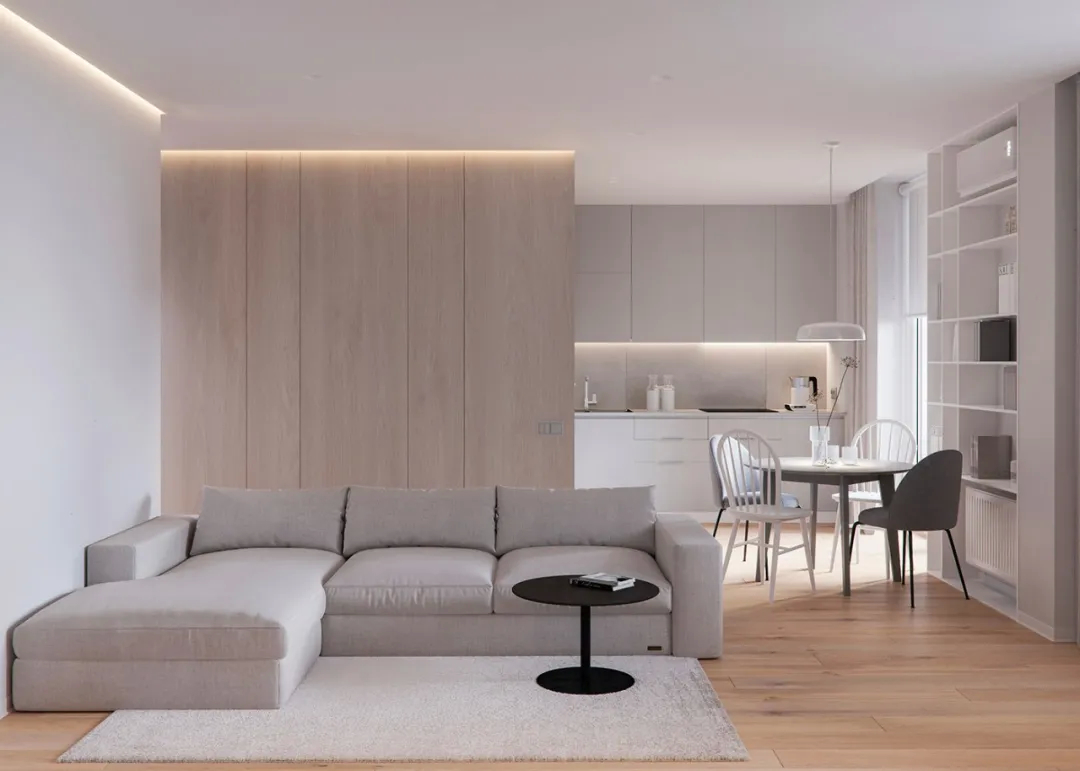 家不需要多么繁杂,也不需要多么华丽,只需要能够让人放松安心就可以了。客厅面积不大,形式简约、人文性,白色的墙面让空间静谧,木色的地板温暖质朴,绿植增添了绿意,给人一种沉稳静谧的感觉。