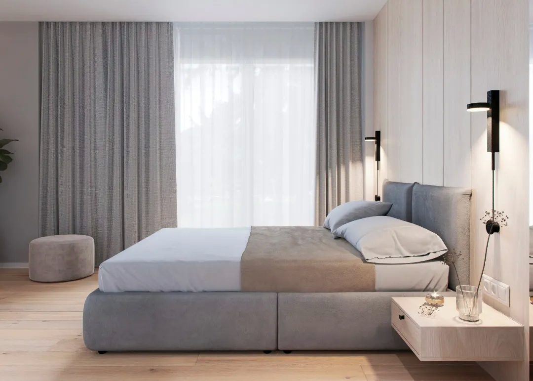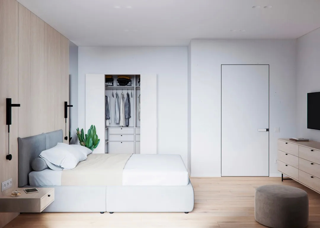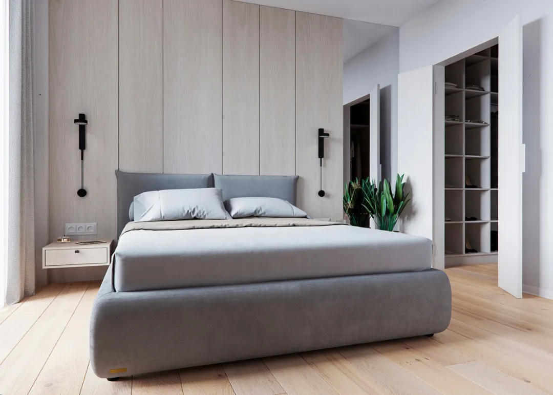这里主卧室中白色的墙面搭配原木色的床头背景和木地板,简约中不失朴素自然。另外搭配一大扇窗户设计,阳光照射进来显得非常温馨。