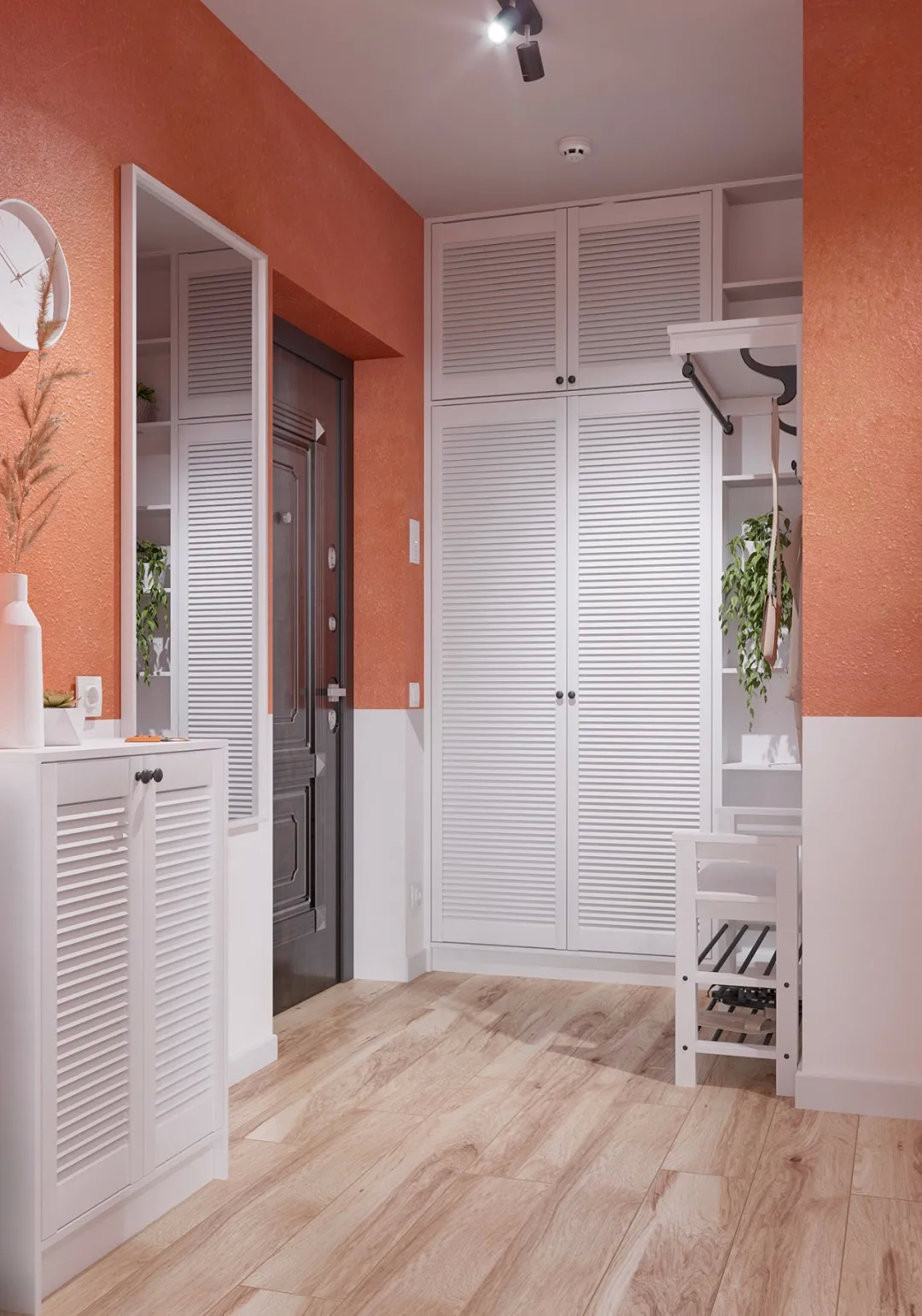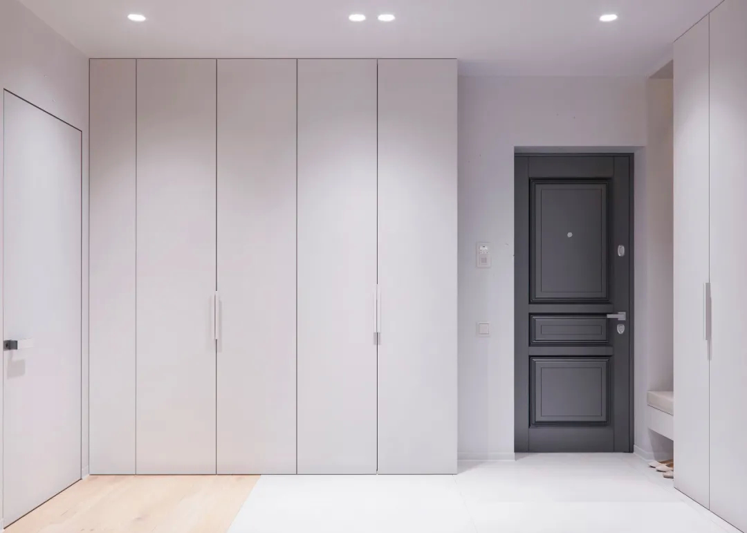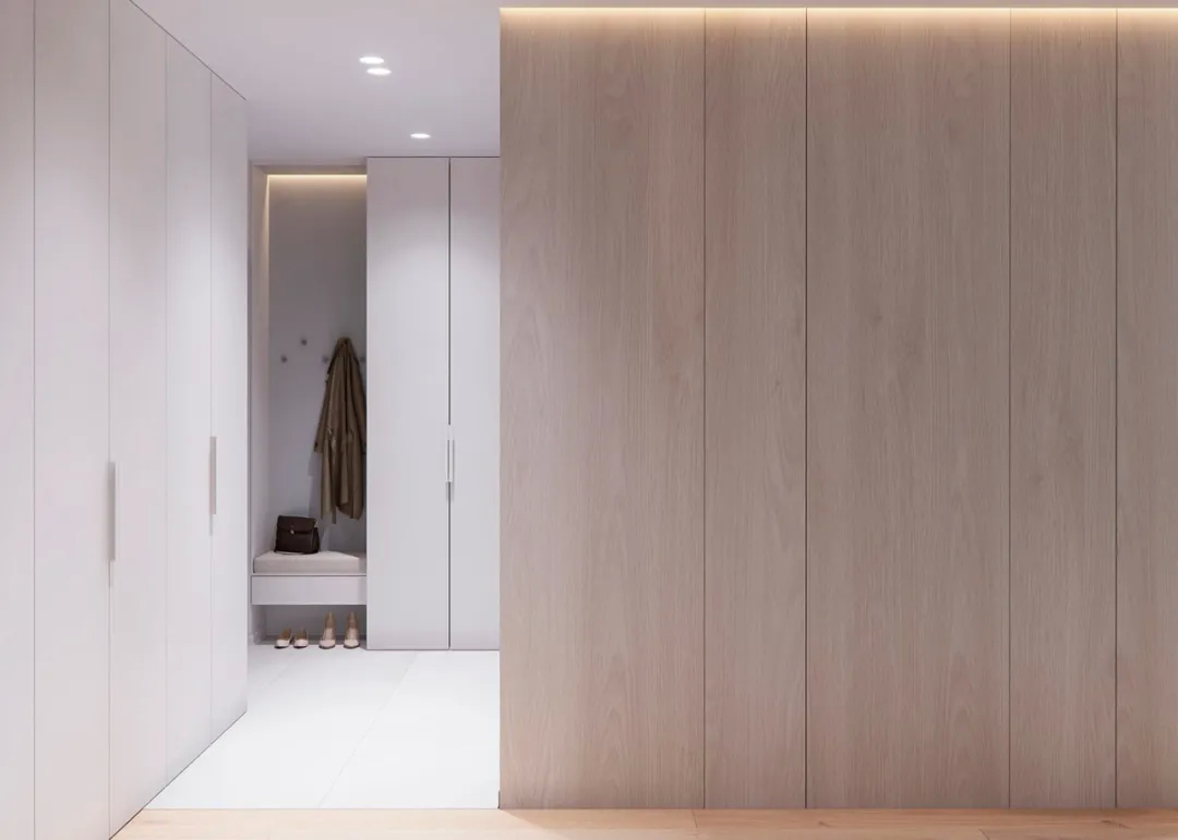 入口处的空间设计白色简洁优雅,两边是大的收纳柜,美观大方而又实用,实用性也没有忽视,储物空间加上坐凳和悬空的桌子,非常人性化。