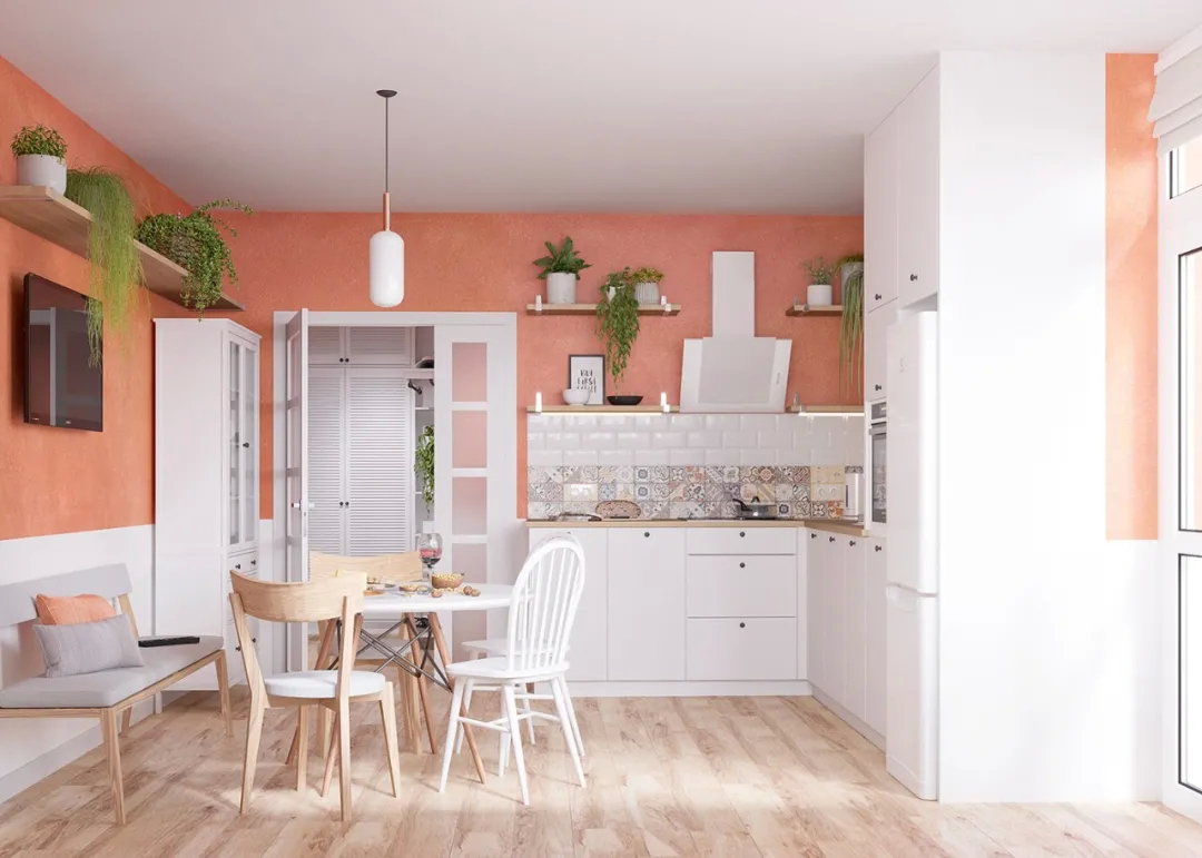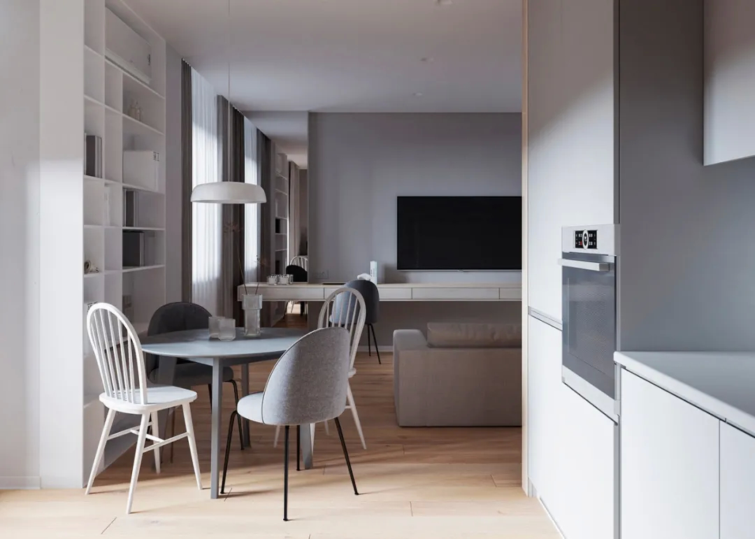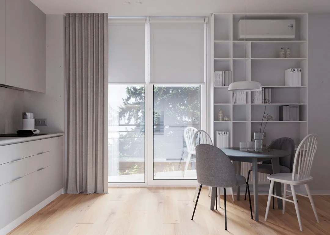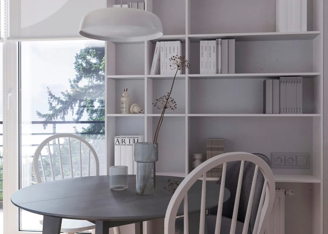 L型的厨房布局,单一的色调,呈现出十分冷静的状态,而各色的软装和餐具的碰撞,顿时让这个空间充满了人间烟火的味道,有爱的生活!