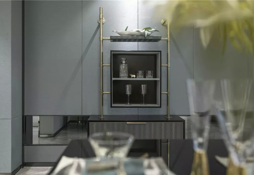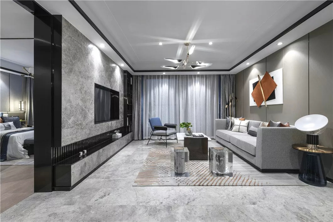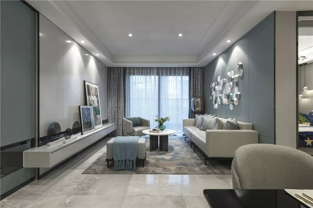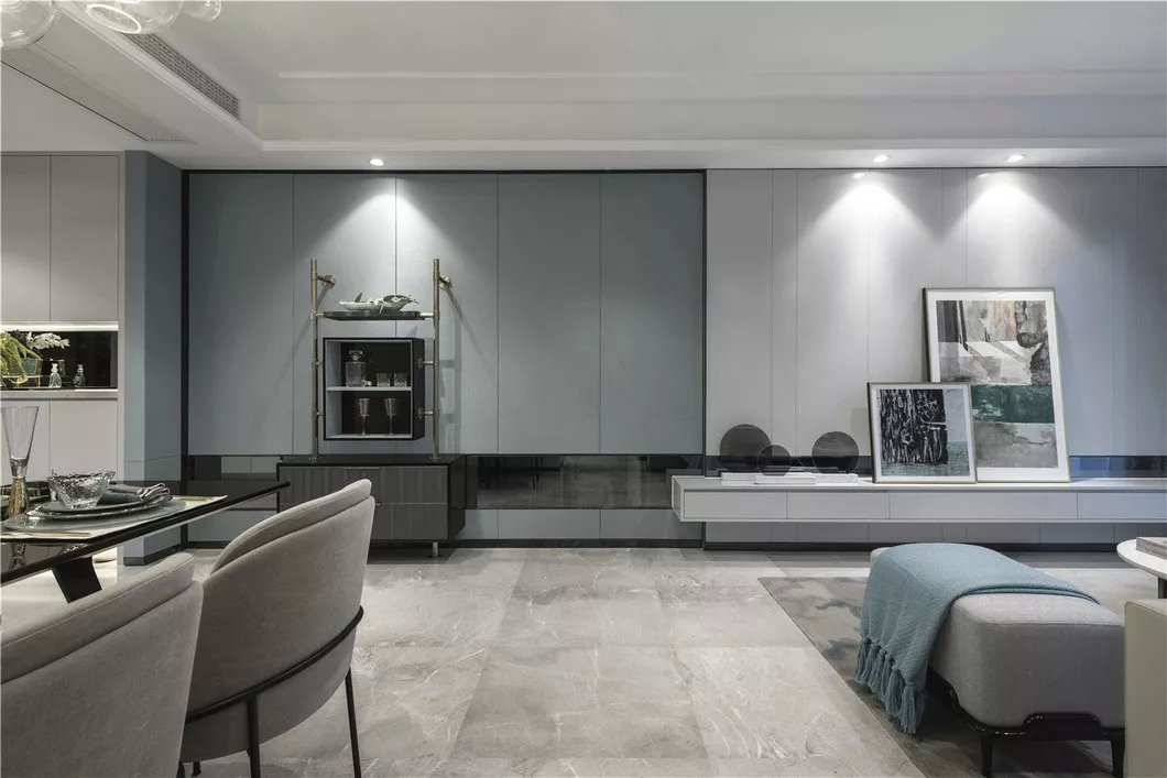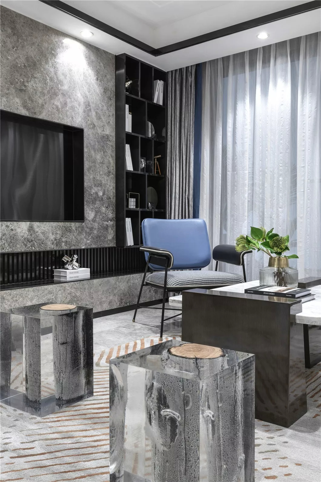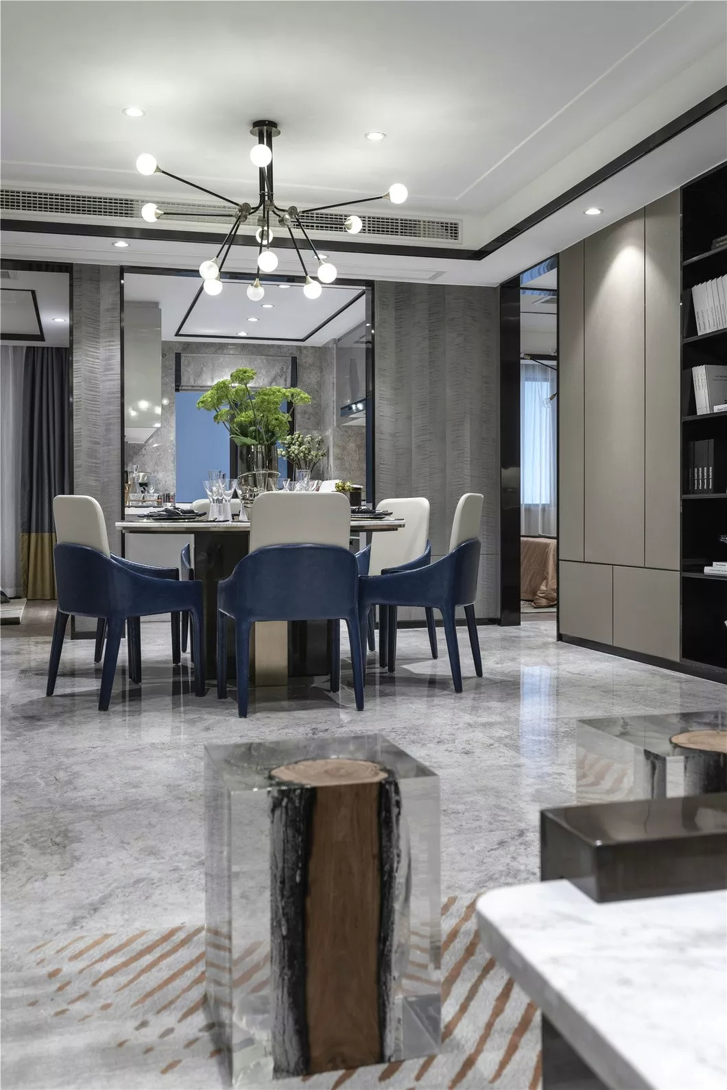 客厅空间摈弃了繁复的装饰,以细节放大我们的感受与空间想象。大理石背景墙上漾开的蓝色水波打破空间的内敛,传递卓绝群伦的个性。光影流动间,似是远山的露霭,营造出自然纯粹之美。