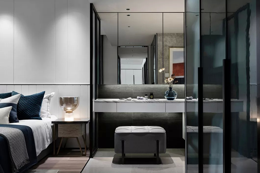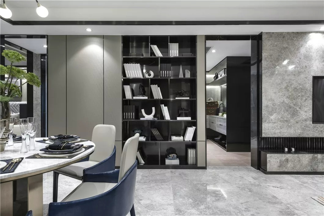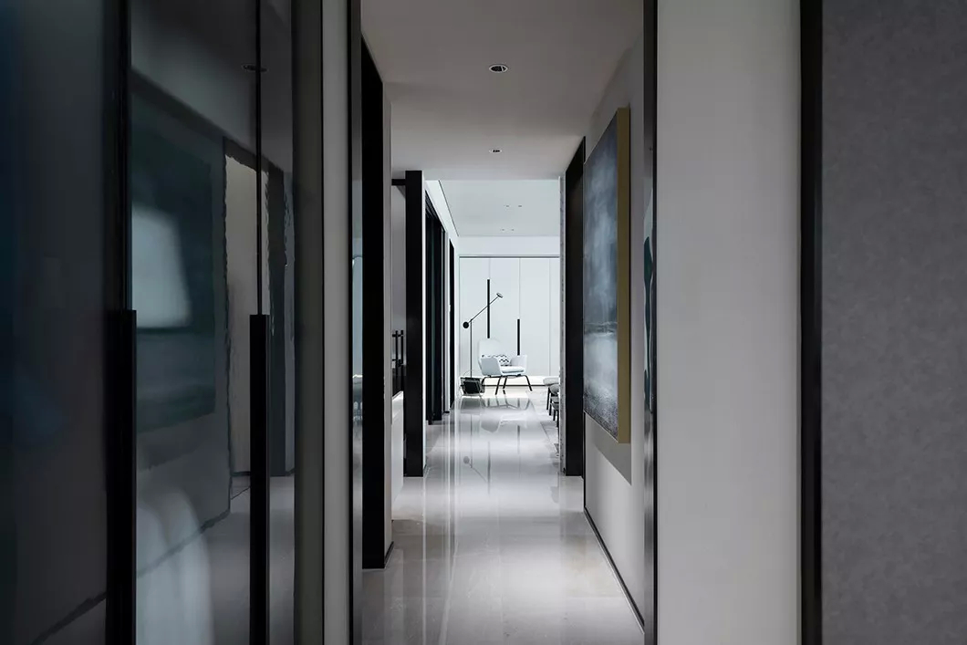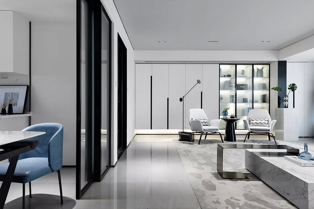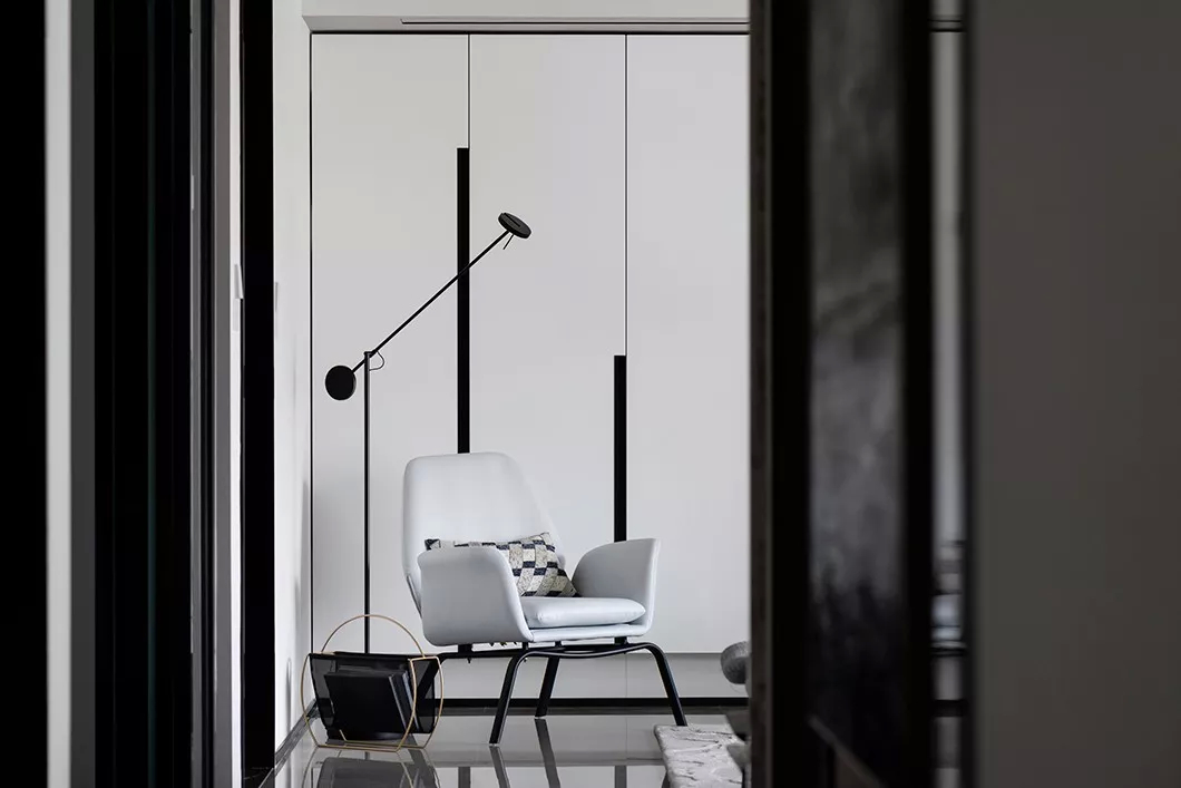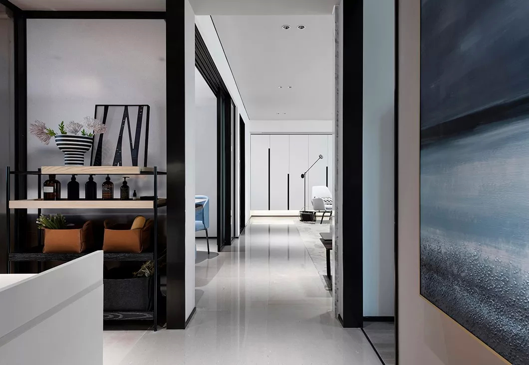 本案从空间布局和界限上突破常规思路,传达的是熟悉中有惊喜,常规中有新意。黑白灰的基色搭配静谧的蓝,跳跃而灵动。在表象的视觉之下,设计师极尽克制,投射出空间的美学与艺术的张力。