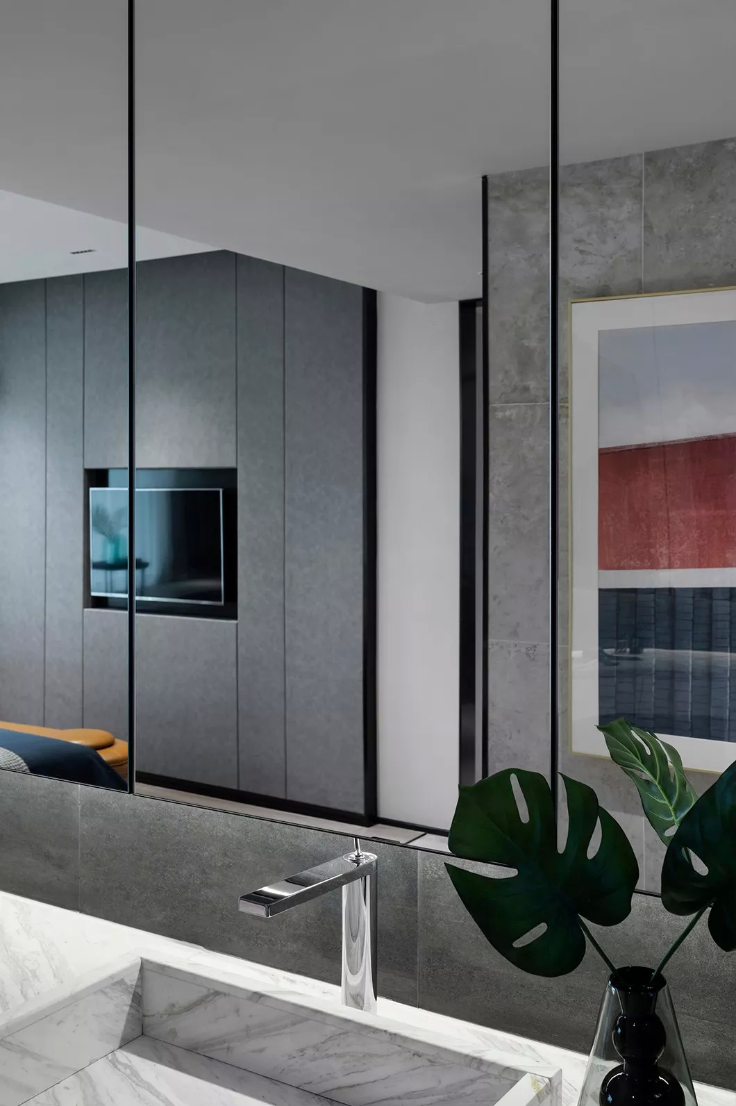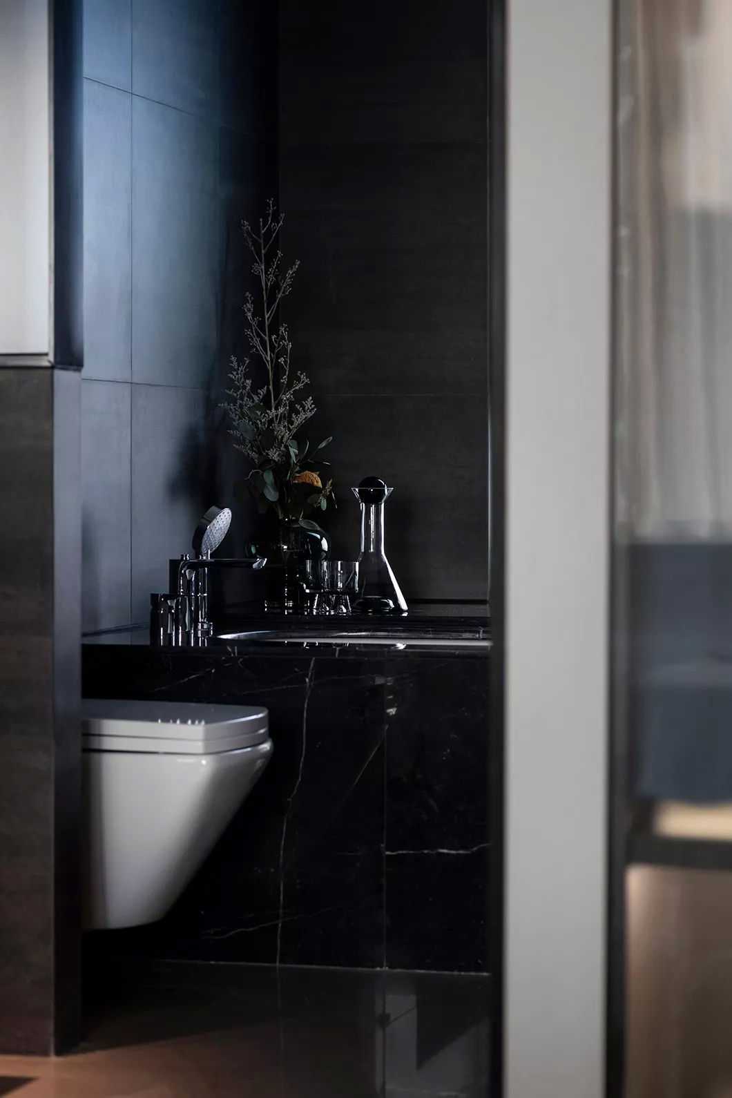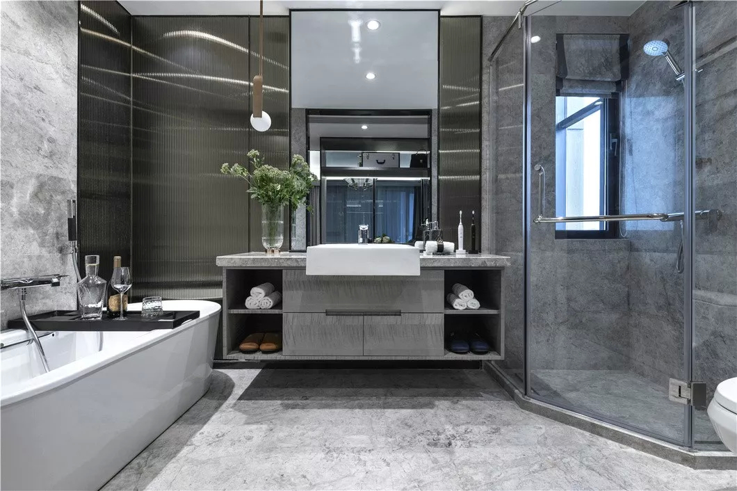 灰色大理石肌理自然淡雅,提供放松或冥想的空间维度。洗手台背景墙面采用金属线条,光影错落间,给空间带来多重变化和惊喜。