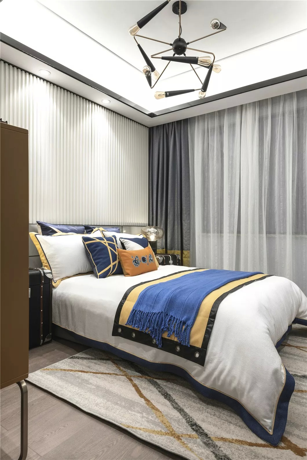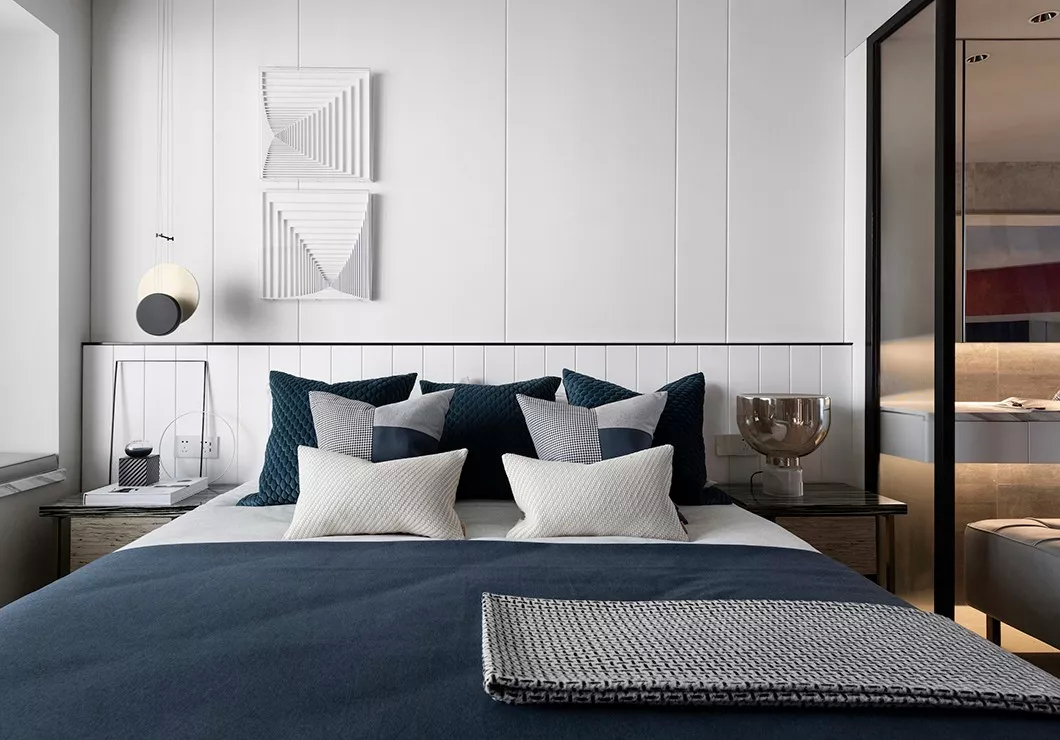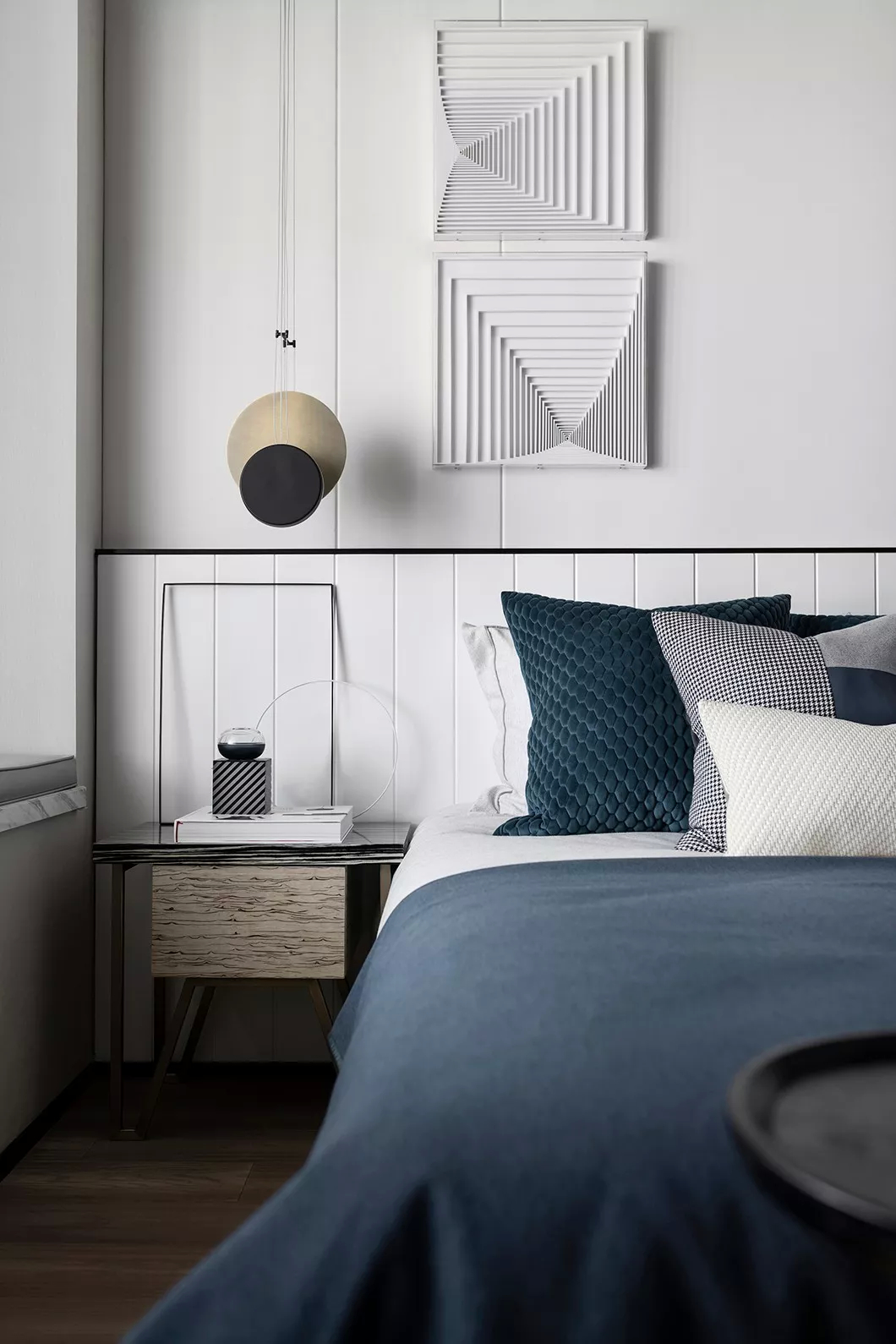 主卧空间,以简约的设计手法构筑纯粹的生活情境。沉稳的蓝色作为主色调引导空间情绪,“线”与“形”的元素贯穿整个场域,静谧与质感的格调氤氲而生。
