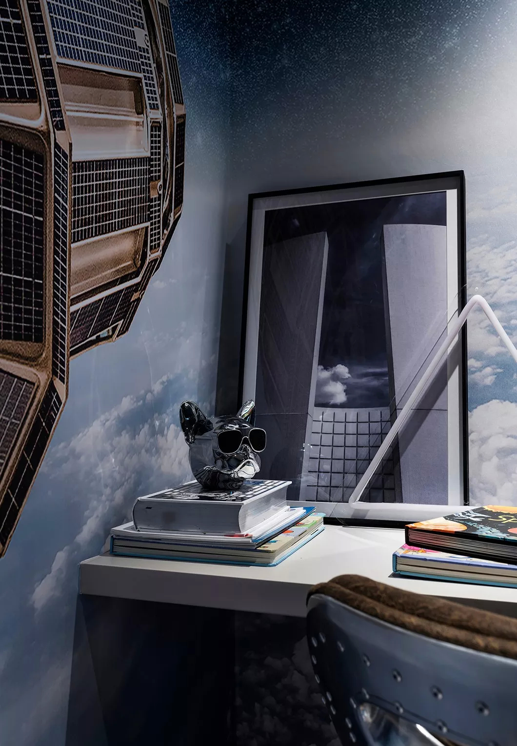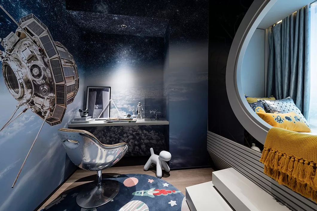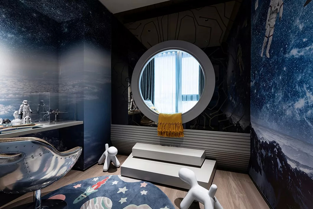 为了解放小男孩童真可爱的天性,设计师选用麦克风造型吊灯,在视觉上呈现出轻松、充满意趣的光感,以激发小朋友的想象力。