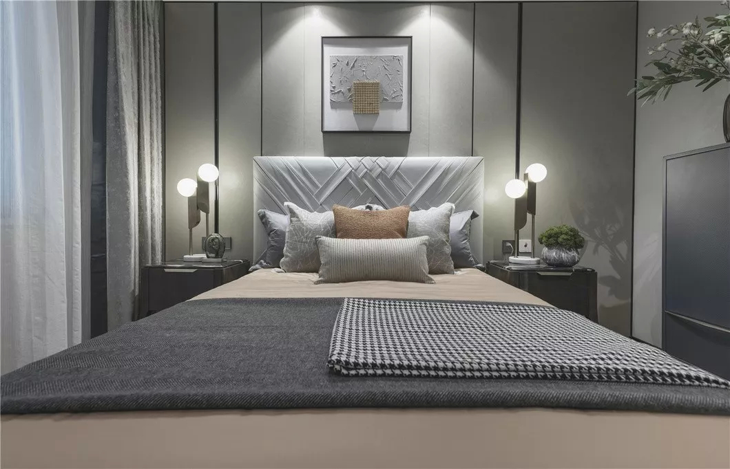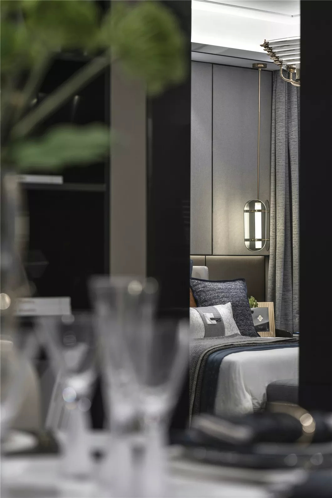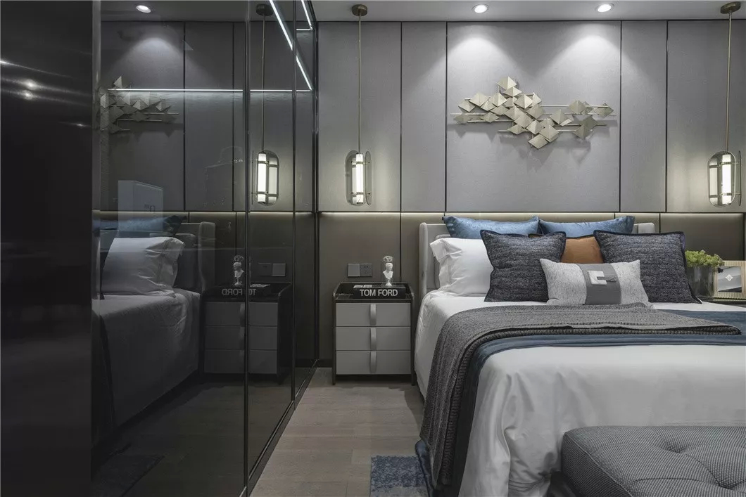 主卧作为睡眠空间,以深浅不一的灰色为基调,辅以棕色和蓝色点缀,体现多层次的丰富内涵。设计师崇尚细致的体验感,于细节处缀以艺术的饰品,不经意间触动人心。
