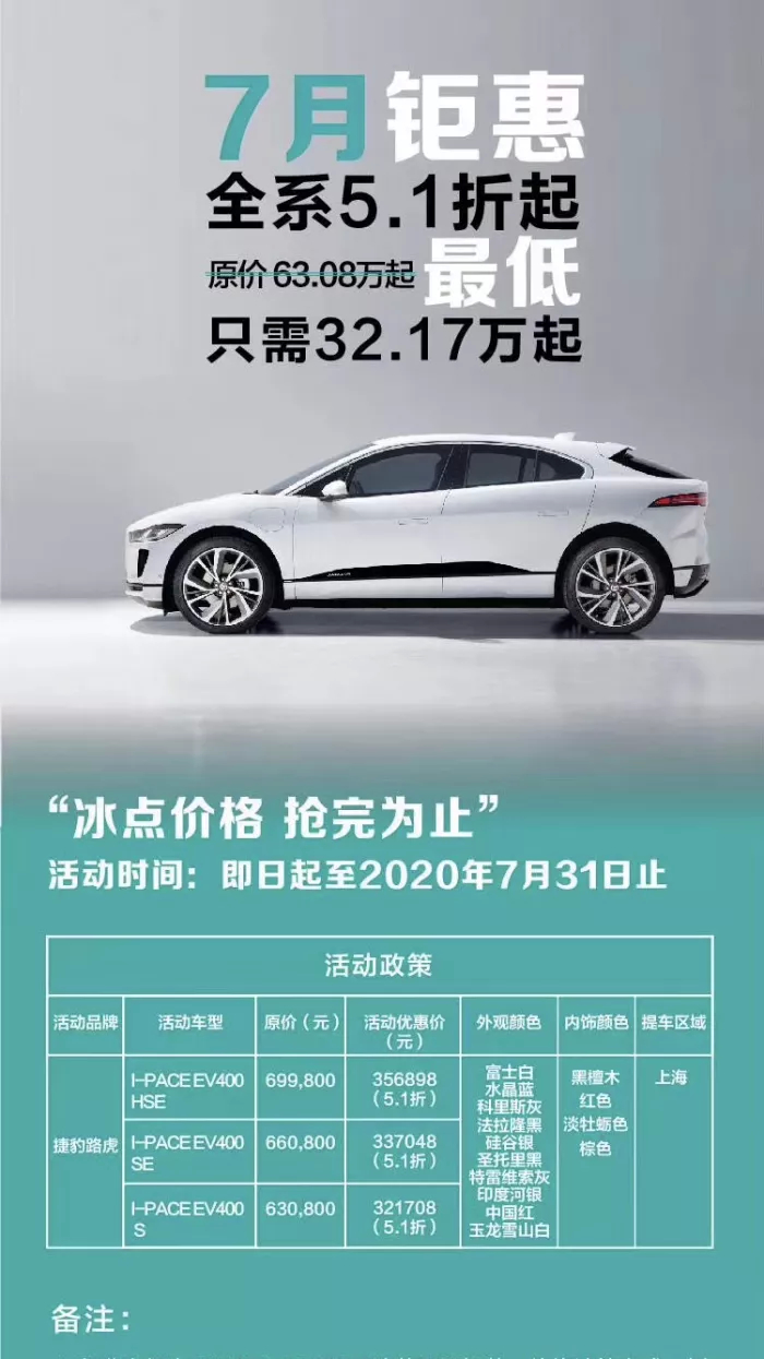 近日,捷豹一则降价信息引起关注:7月31日前上海地区销售的捷豹I-PACE全系车型5.1折销售。实际上,对于捷豹I-PACE五折卖车的消息实际上并不意外,因此前部分经销商对这款车已进行过半价销售。更有消费者将捷豹戏称为“骨折豹”。