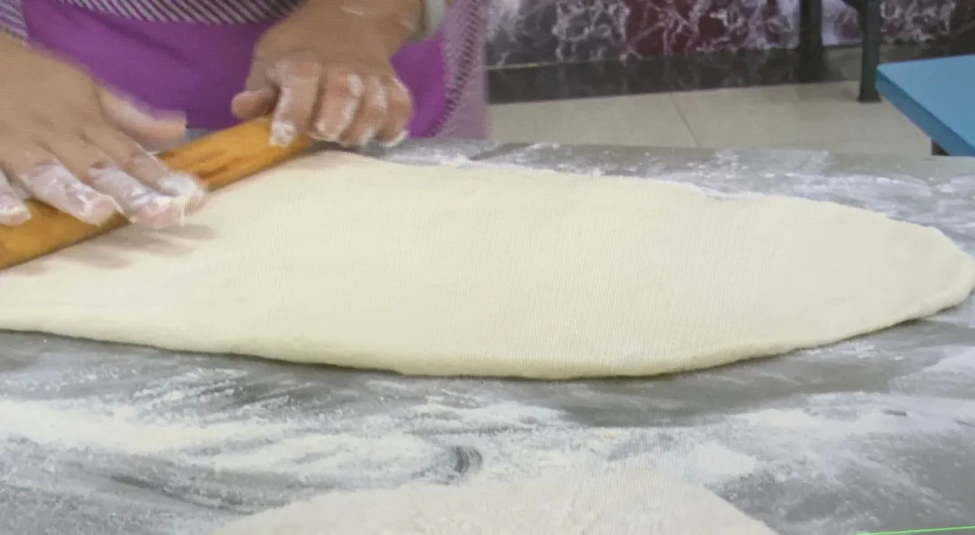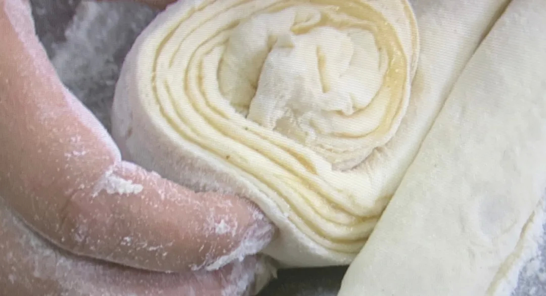 把面从头部卷起来,卷成大圆饼。