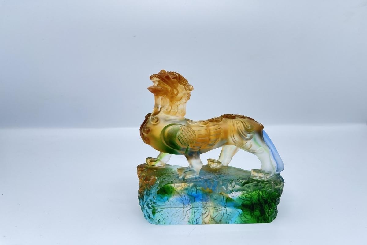 麒麟,是中国古代神话中的一种瑞兽,人们希望麒麟总是伴随着自己,给自己带来幸运和光明。作品中的麒麟引颈向上,仿佛马上要腾空而起,一跃冲天。此藏品现馆藏于山东省淄博市博山区西冶琉璃文化博物馆。