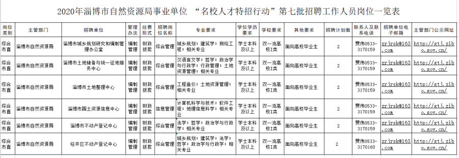为优化人才队伍结构,决定开展“名校人才特招行动”(第七批),淄博市自然资源局局属事业单位引进急需紧缺人才。按照《事业单位人事管理条例》及有关规定,现就2020年淄博市自然资源局事业单位“名校人才特招行动”(第七批)招聘有关事项公告如下。