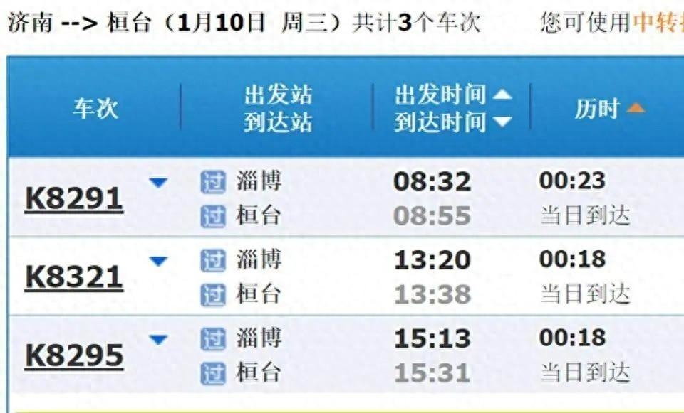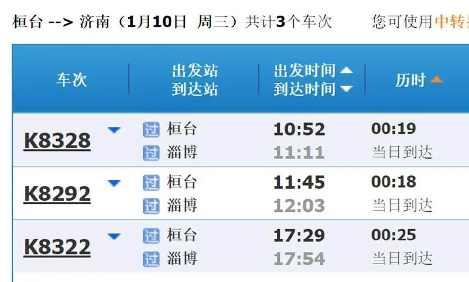 记者发现,上述6趟列车均在淄博站与桓台站停靠,两站之间的运行时间为18一25分钟,硬座成人票价格为9元。而济南站至桓台站的运行时间则在1小时31分钟一1小时47分钟,硬座成人票为21.5元/张。