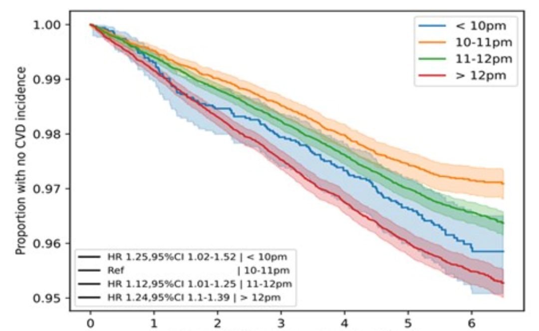 研究人员把这些人分成四组:晚上10:00 前入睡、晚上10:00~10:59入睡、晚上11:00~11:59 入睡和午夜后才入睡。然后,他们对参与者进行了平均5.7年的随访,统计谁在这段时间里新发了心血管疾病(如心梗、中风、心衰等)。