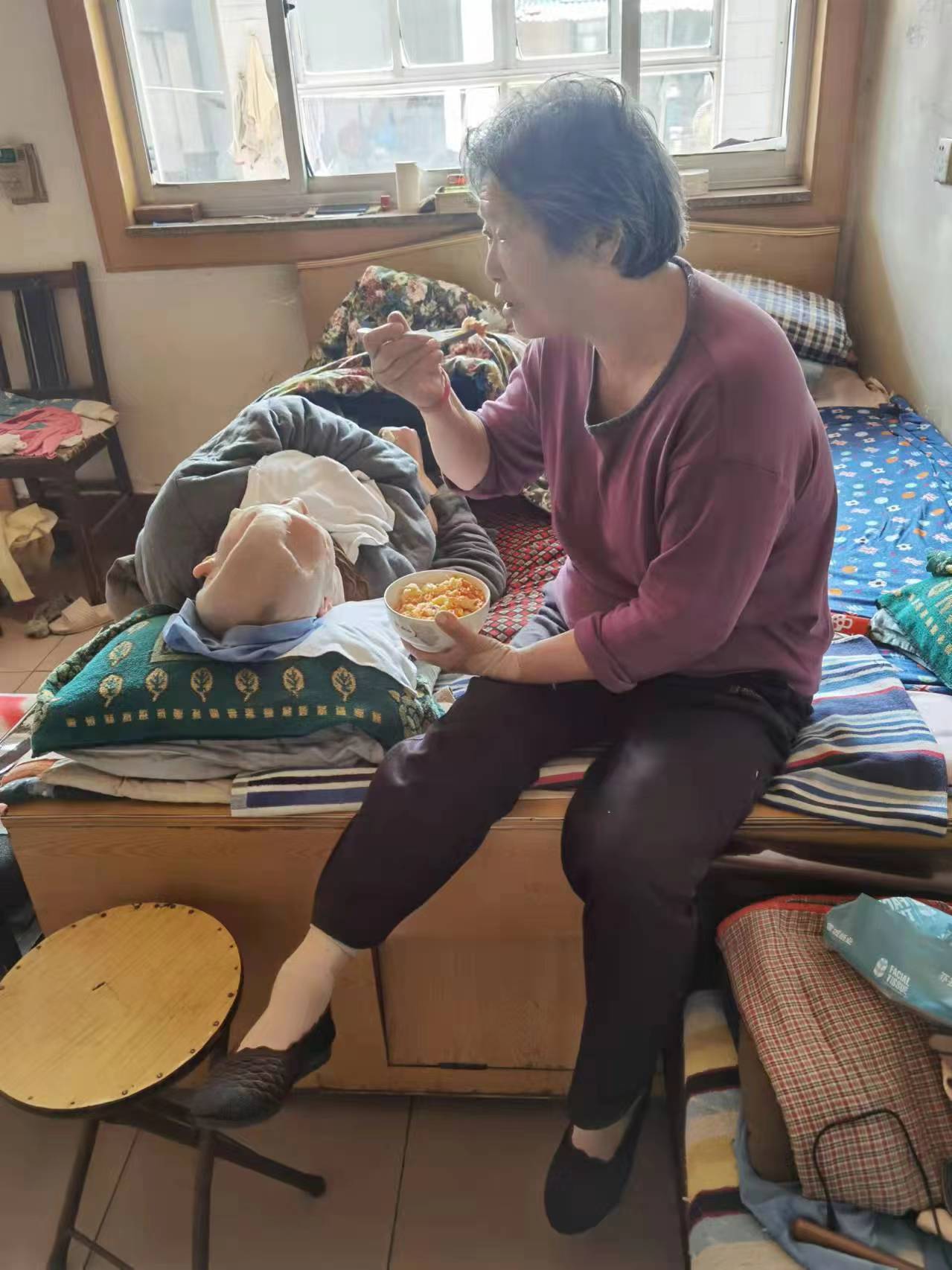 如果不是亲眼所见,不敢相信一个瘦弱的妇女可以独自一人把一个远超自己体重的男人从床上一步步地挪到椅子上坐下,再一步步挪回去,十四年来日复一日从没有间断过。每天的一日三餐,都是切碎剁细了,一勺一勺地慢慢喂进去,有时候一顿饭要喂大半个小时。