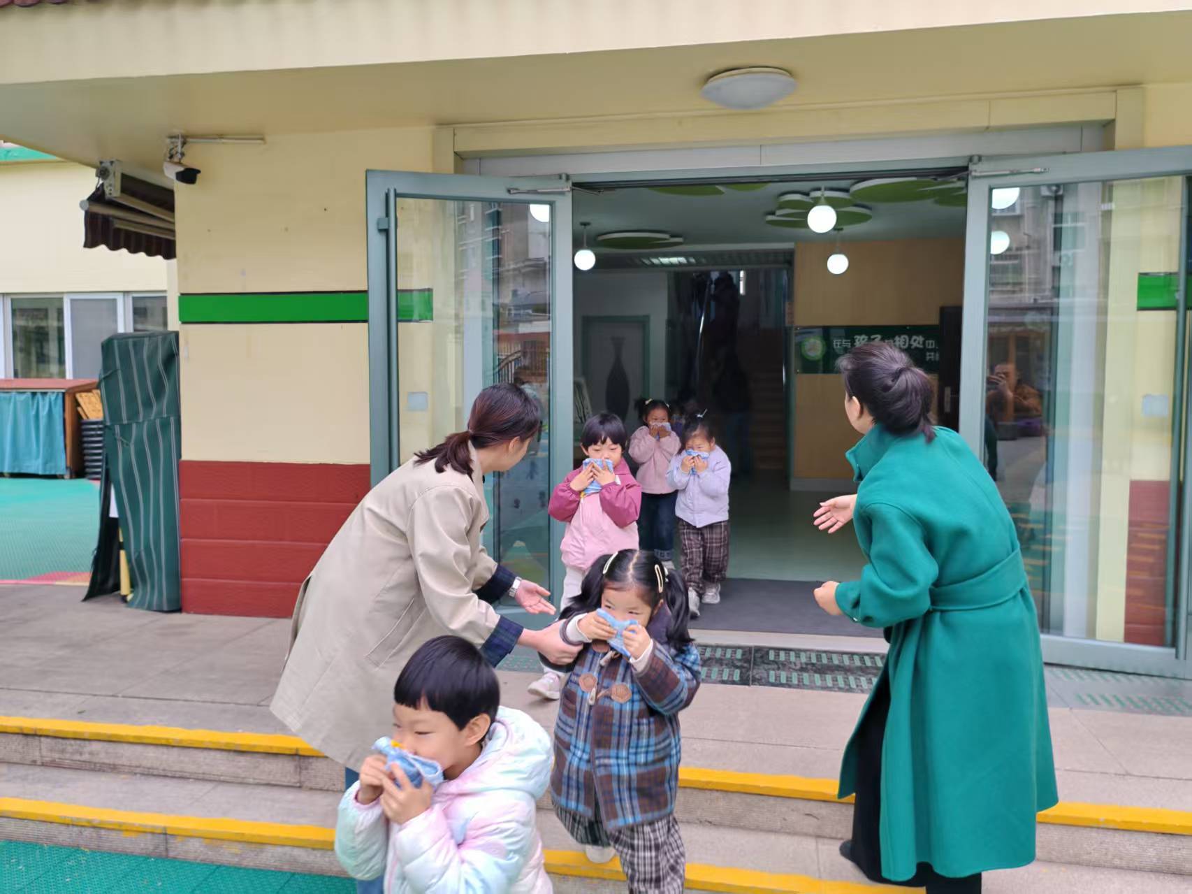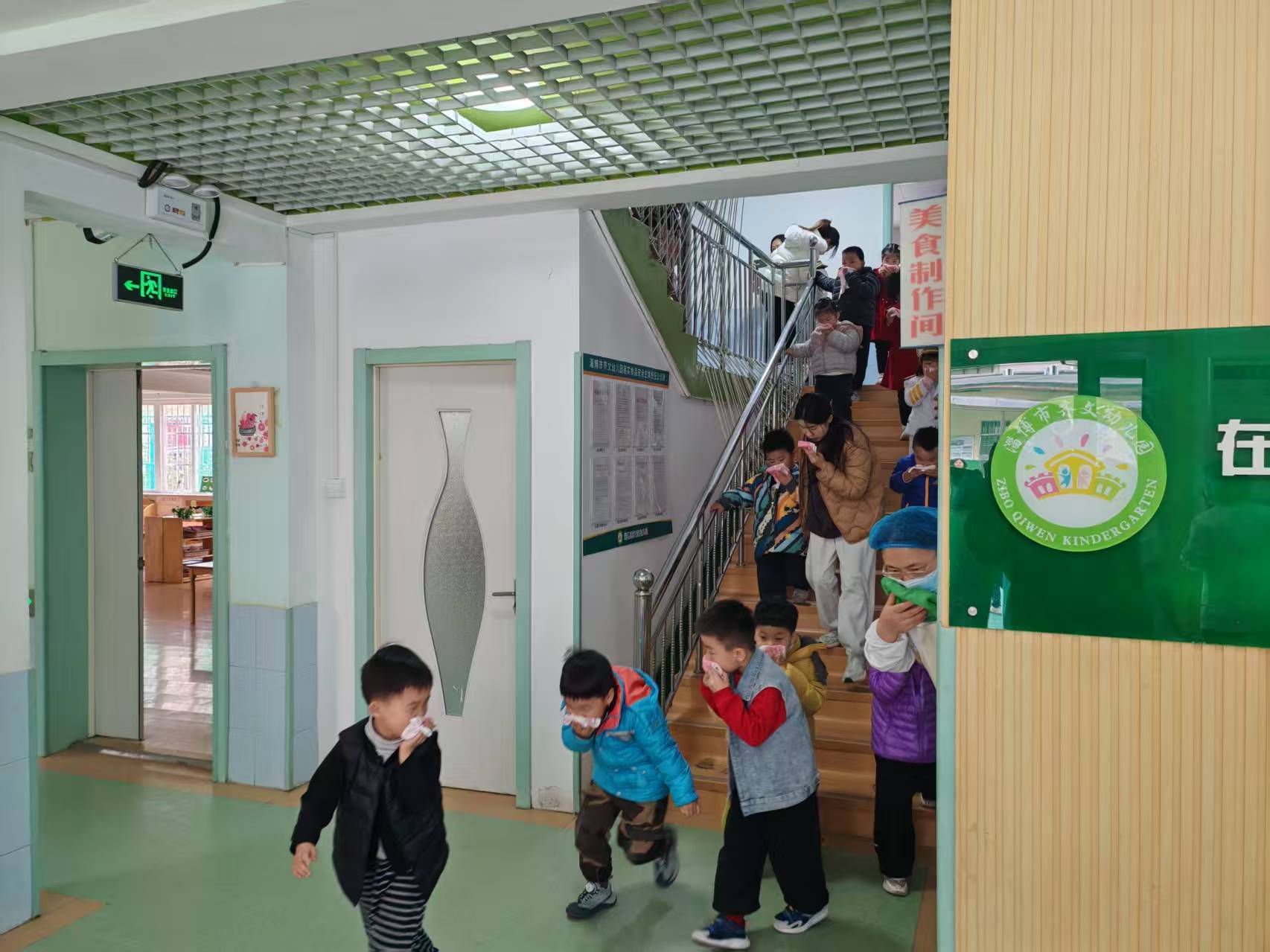 在淄博市齐文幼儿园,一场火灾疏散逃生演练正在紧张进行。随着一阵急促的警报声响起,全园师生迅速进入“火场逃生”状态。孩子们用湿毛巾捂住口鼻,在全园教职员工的引导下,沿着预定路线快速有序地撤离至操场安全区域。整个过程紧张而不慌乱,孩子们在亲身体验中记住了疏散逃生要领。疏散结束后,邀请几位“小勇士”讲述自己的逃生技巧。