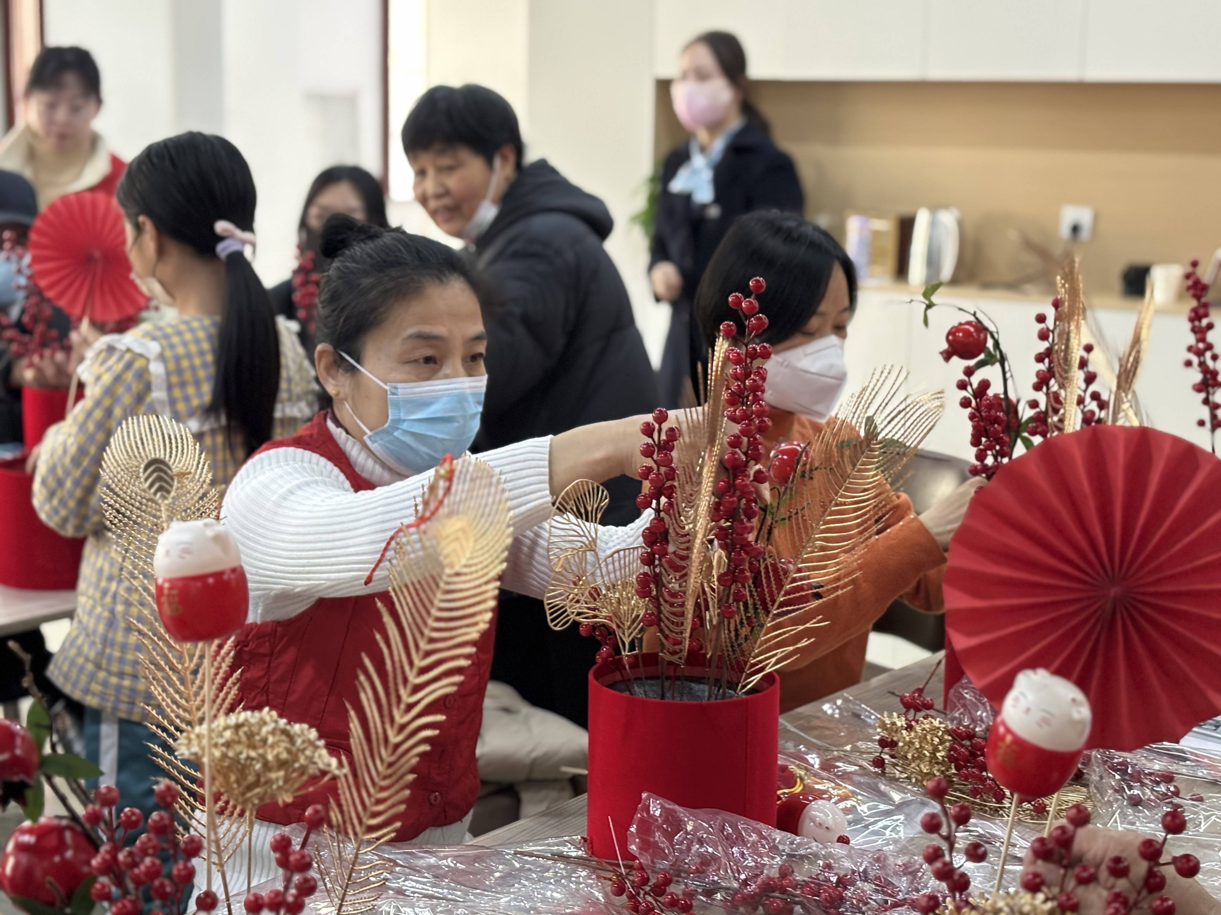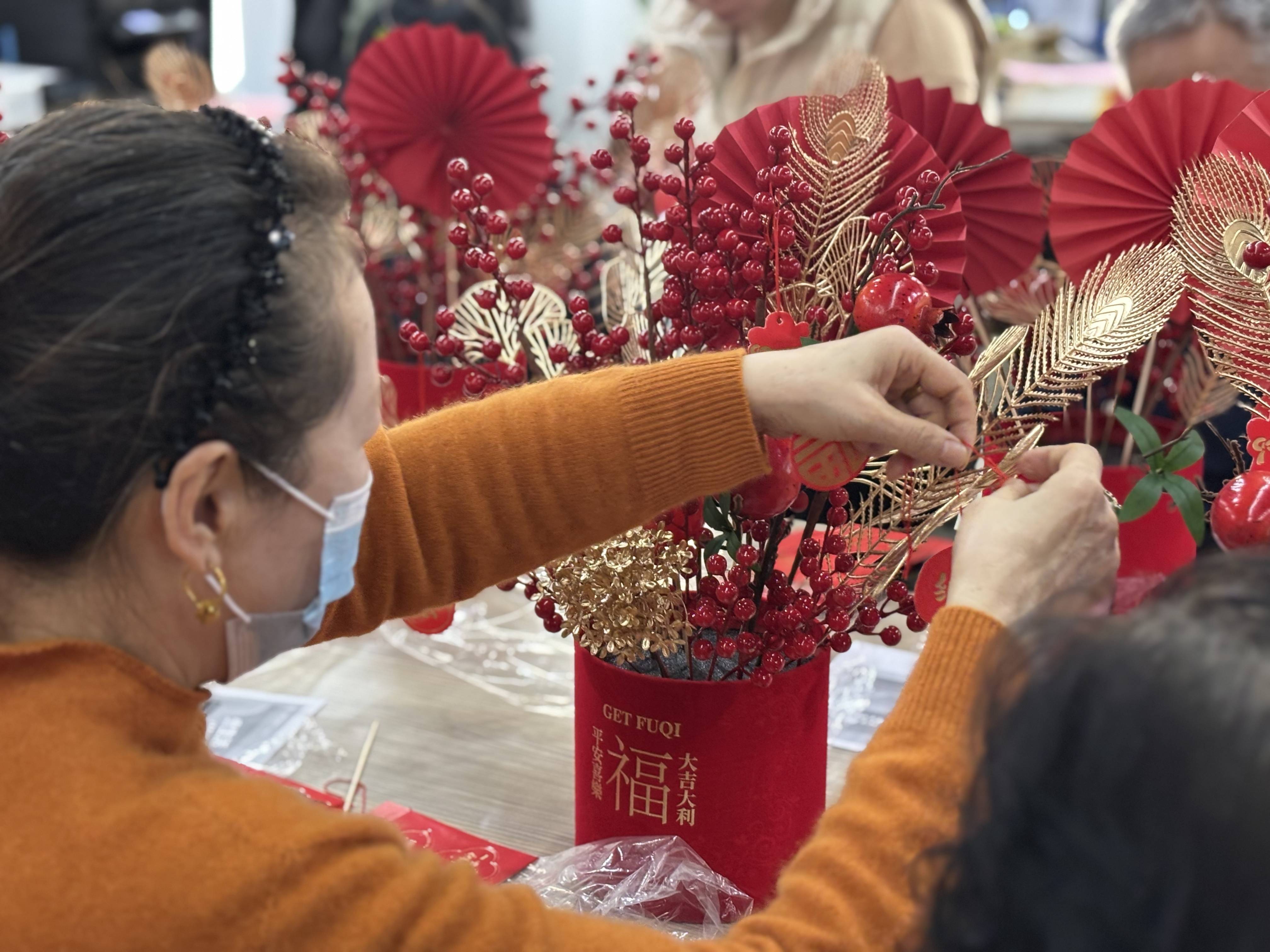 活动现场,居民在专业指导下亲手制作年宵花福桶,以巧手装点新春;猜经典年味歌曲、抽新春盲盒福袋等互动环节笑声不断,民生银行工作人员与社区志愿者一同为每个家庭送上春联与福字,将“‘泰’有年味儿”的氛围推向高潮。