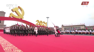 56门礼炮鸣放100响,致敬党的百年光辉历程。222名仪仗队员组成国旗护卫队,正步走过天安门广场。鲜红的党旗由直升机梯队护卫、迎风向前,武直10战机排列成100的队型飞跃天安门上口,国产歼十战机排列成“71“的队形飞跃人民英雄纪念碑,15架国产歼20战机分列3个梯队飞轰鸣而过,向党致敬、向祖国致敬、向人民致敬。