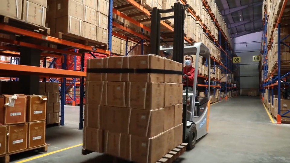 张学星在新星物流中心开了近20年的叉车,他每天的工作就是驾驶叉车在高高的货架间搬运酒水。张学星告诉我们,这些货架每个都在7米多高,稍有不慎,就容易损坏货物。