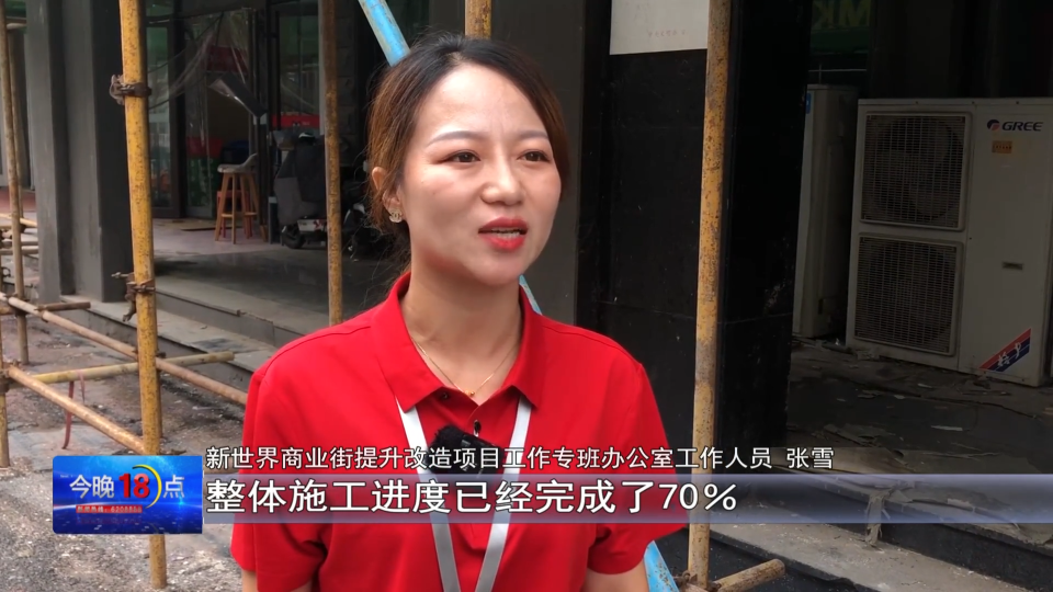 新世界商业街提升改造项目工作专班办公室工作人员 张雪:日前,我们的新世界商业街提升改造项目的整体施工进度已经完成了70%,这其中包括雨污分流、消防水源、净化排污以及商亭的上下水预埋,接下来还会进行路面的铺装、广告牌的统一更换、灯光亮化的安装。