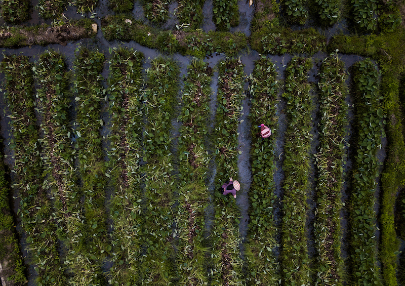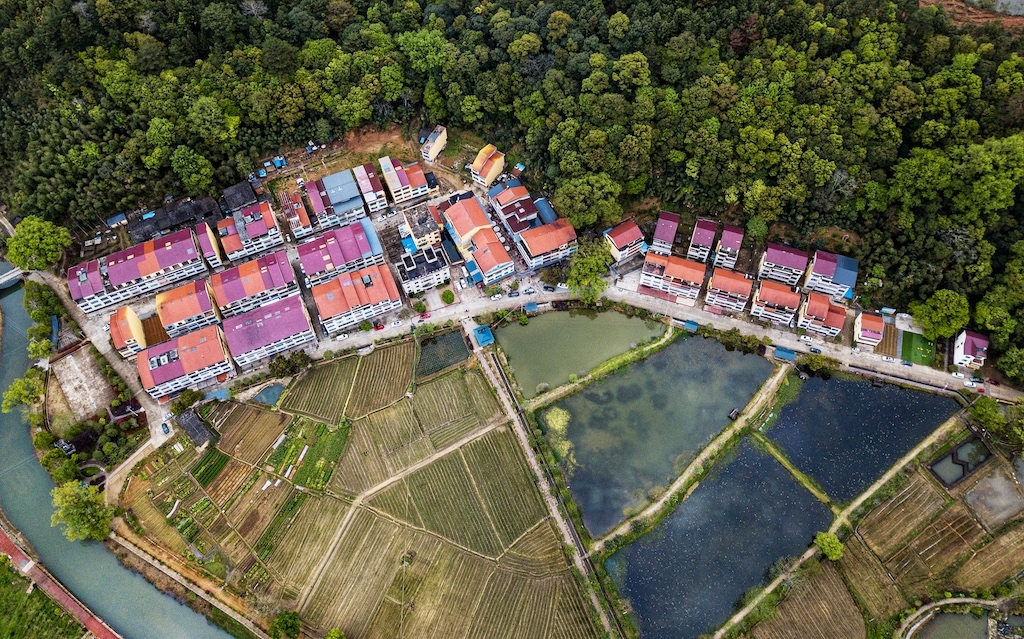 △俯瞰沙县俞邦村,田地里种植的芋子是沙县小吃的重要原料。(总台国广记者李晋拍摄)