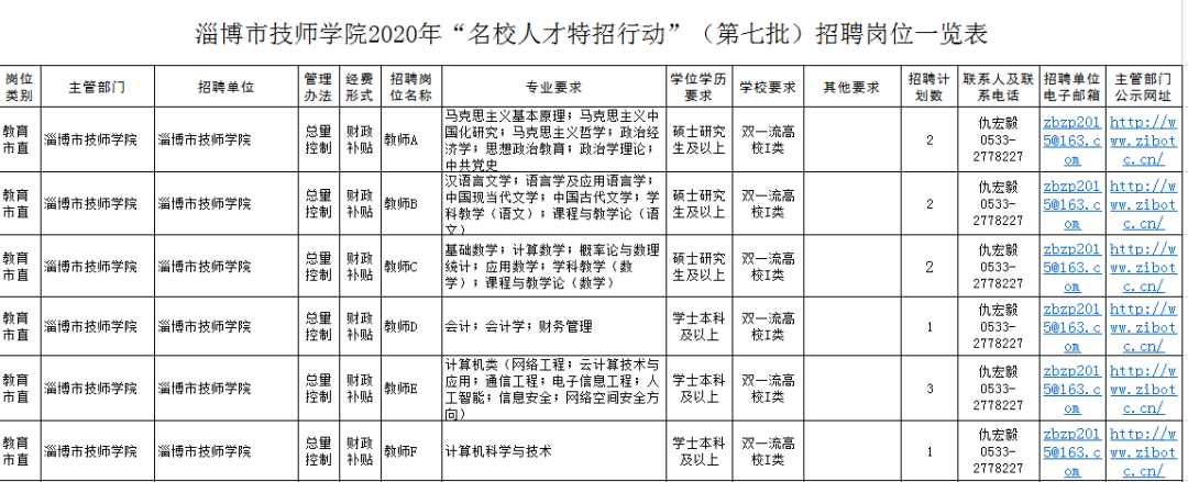 按照《事业单位人事管理条例》及有关规定,现就淄博市技师学院“名校人才特招行动”(第七批)招聘有关事项公告如下。 招聘范围 按照中共中央组织部办公厅、人力资源社会保障部办公厅《关于应对新冠肺炎疫情影响做好事业单位公开招聘高校毕业生工作的通知》(人社厅发〔2020〕27号)文件要求:“今明两年事业单位空缺岗位主要用于专项招聘高校毕业生(含择业期内未落实工作单位的高校毕业生)”。本次特招主要面向未落实工作单位的2018至2020届高校毕业生。 招聘岗位 招聘办法