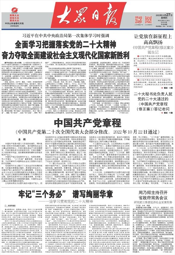 党的二十大是在全党全国各族人民迈上全面建设社会主义现代化国家新征程、向第二个百年奋斗目标进军的关键时刻召开的一次十分重要的大会,是一次高举旗帜、凝聚力量、团结奋进的大会。大会通过的报告,高举中国特色社会主义伟大旗帜,全面贯彻习近平新时代中国特色社会主义思想,回顾总结过去五年的工作和新时代十年的伟大变革,系统阐述开辟马克思主义中国化时代化新境界、中国式现代化的中国特色和本质要求等重大问题,擘画全面建成社会主义现代化强国的宏伟蓝图和实践路径,就未来五年党和国家事业发展制定大政方针、作出全面部署,是我们党团结带领全国各族人民夺取中国特色社会主义新胜利的政治宣言和行动纲领,是一篇闪耀着马克思主义真理光辉的纲领性文献。