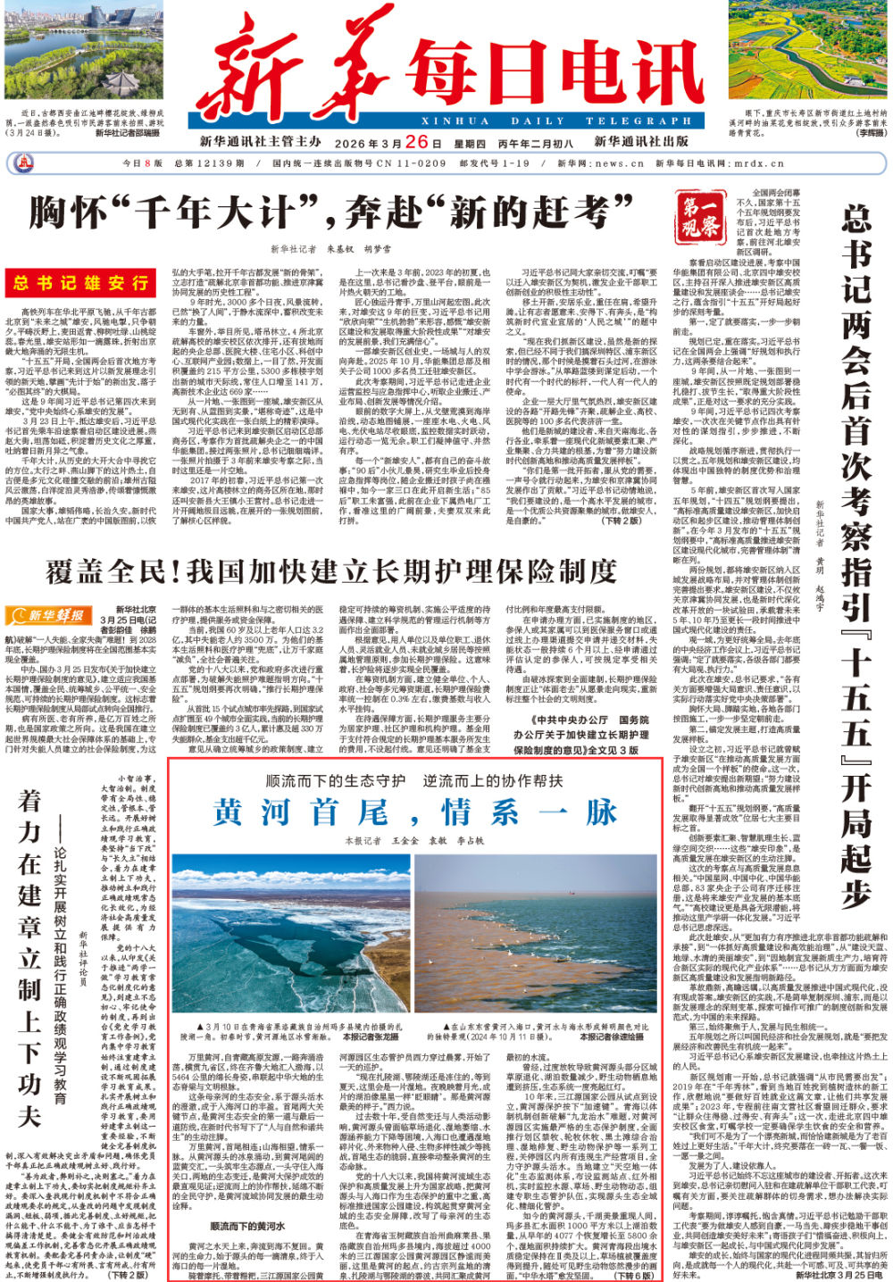 万里黄河,首尾相连;山海相望,情系一脉。从黄河源头的冰泉涌动,到黄河尾闾的蓝黄交汇,一头筑牢生态源点,一头守住入海关口,两地的生态变迁,是黄河大保护成效的最直观见证;逆流而上的协作帮扶,延绵不断的全民守护,是黄河流域协同发展的最生动诠释。