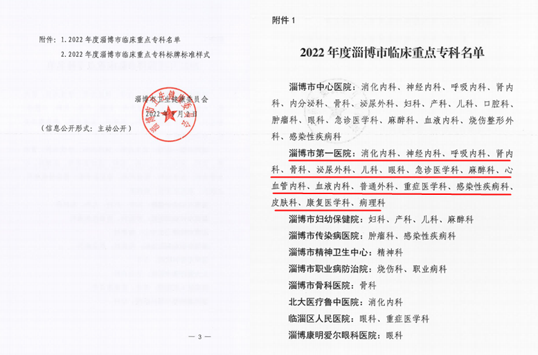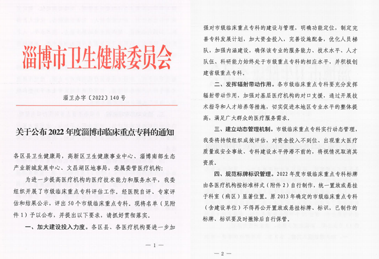 近日,淄博市卫生健康委下发《关于公布2022年度淄博市临床重点专科的通知》,淄博市第一医院18个专科榜上有名,这是医院重点专科建设进程中的一次新的跨越。