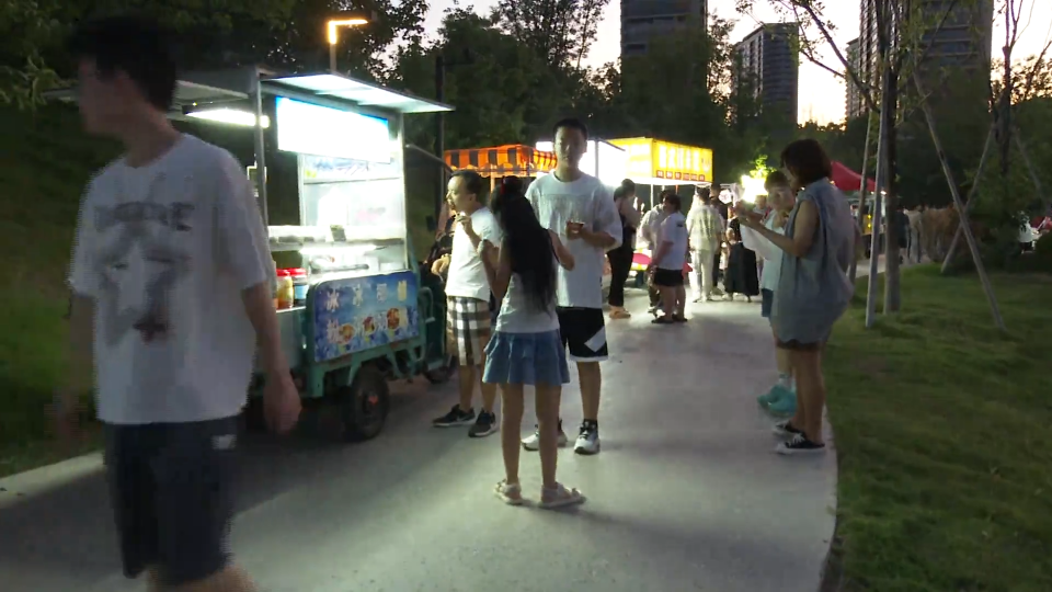 市民:晚上吃了饭带着孩子,来散散步玩一会,真的是挺好的,而且还有这么多卖吃的,小朋友挺喜欢。