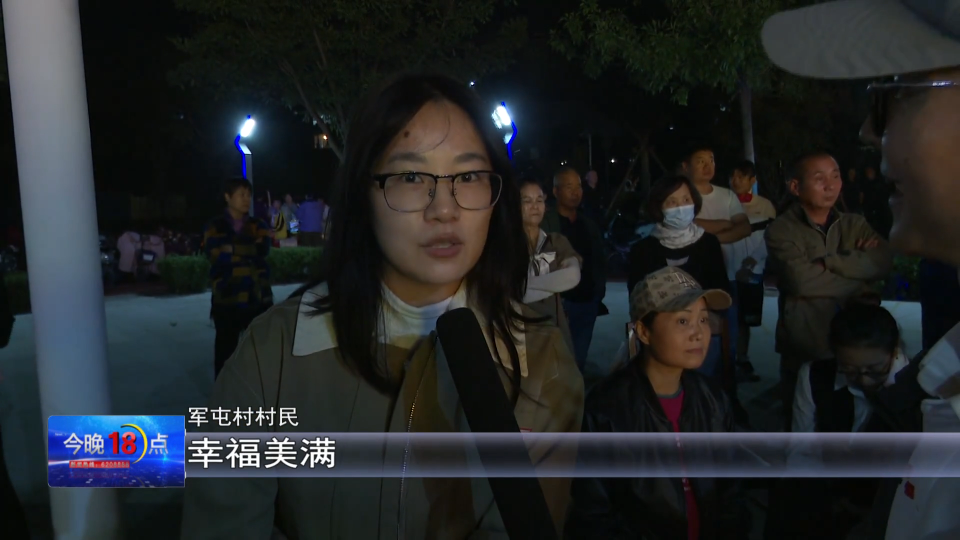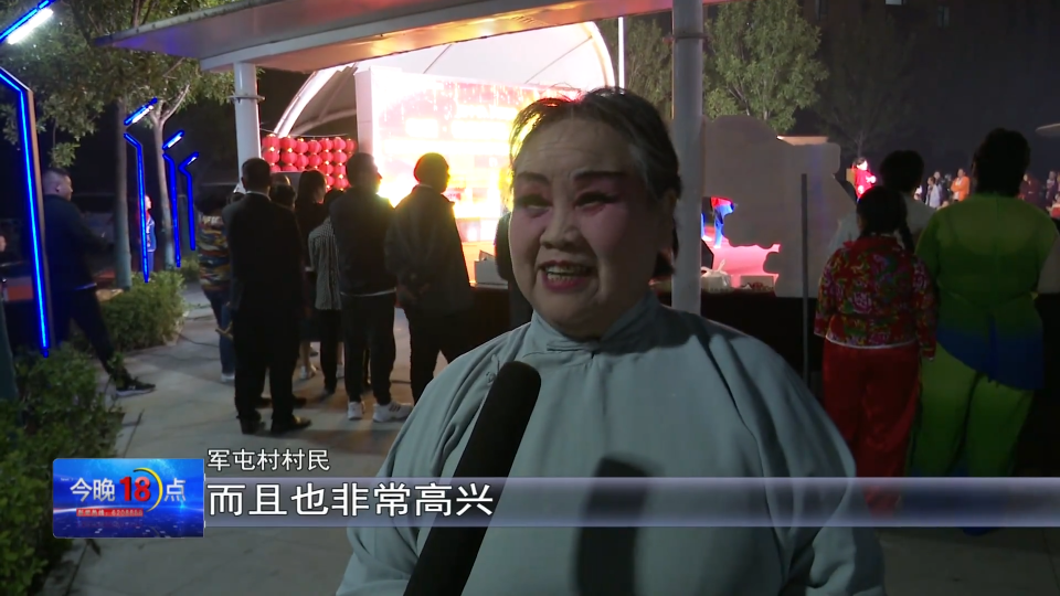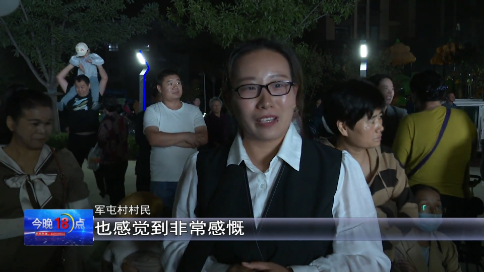 军屯村村民:通过我们的节目,展现我们军屯村新村风新面貌,老百姓的心情非常激动,而且也非常高兴,所以说我们今天晚上大家都非常卖力,演的特别高兴。