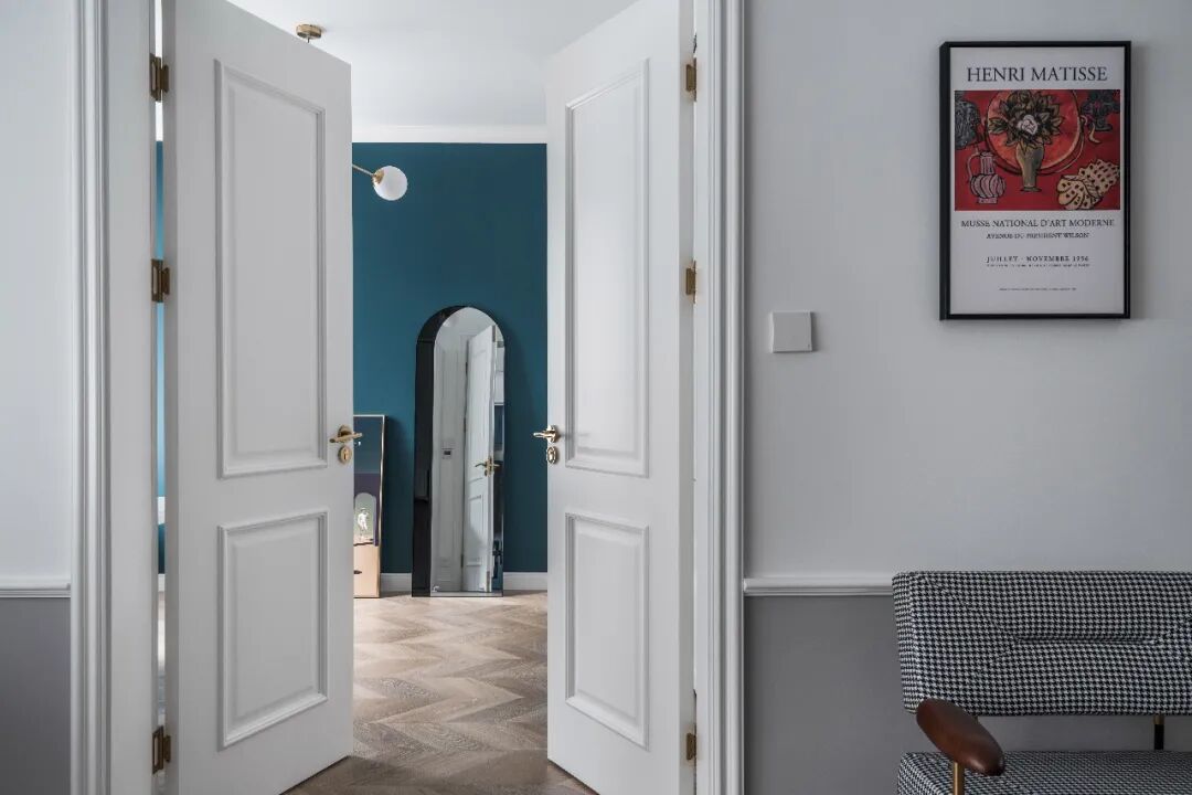在客厅另一侧,设计师做了具有仪式感的双开门,两侧连接过道处设计了半高石膏线,搭配北欧的高级灰涂料做分色,灰白相间的色彩,同时兼具柔软感、刚硬感、温暖感和冷漠感,这种百搭提气的高级灰调非常适合在家居空间中。