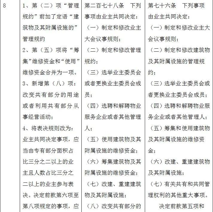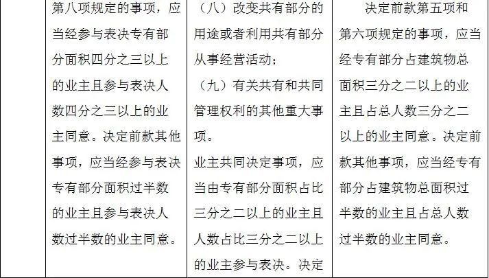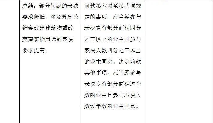 一、变更了物权法中的表决规则;包括使用公维金等一般事项由"双过半"表决通过改为"双三分之二参与"且经参与投票人"双过半"通过。一般事项降低了表决通过的难度,可降低至"双三分之一"表决通过。筹集维修资金等重大事项的表决要求提高,变更为"双四分之三"表决通过。