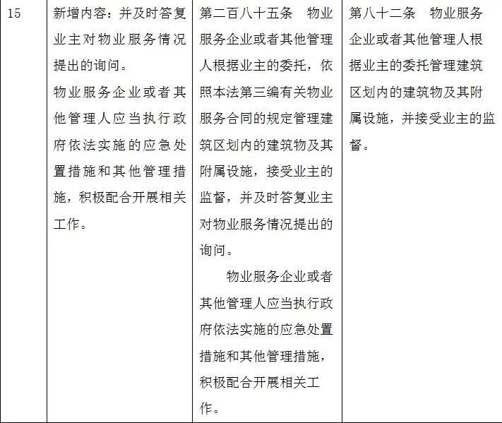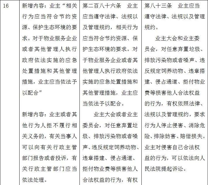 六、新增对业主行为的要求:业主"相关行为应当符合节约资源、保护生态环境的要求。对于物业服务企业或者其他管理人执行政府依法实施的应急处置措施和其他管理措施,业主应当依法予以配合"。