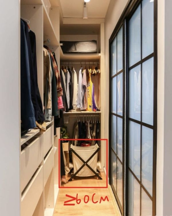 如果这个空间是墙体,那就看看是否是承重墙,如果不是,那就敲掉一面墙,装上玻璃门,一个迷你衣帽间就这样诞生了。