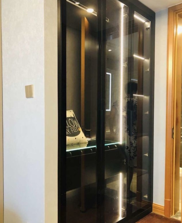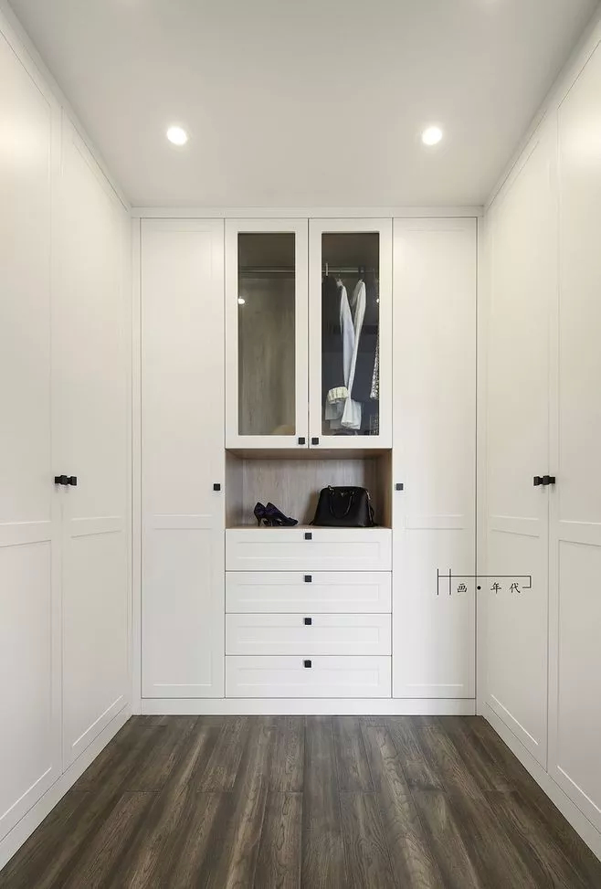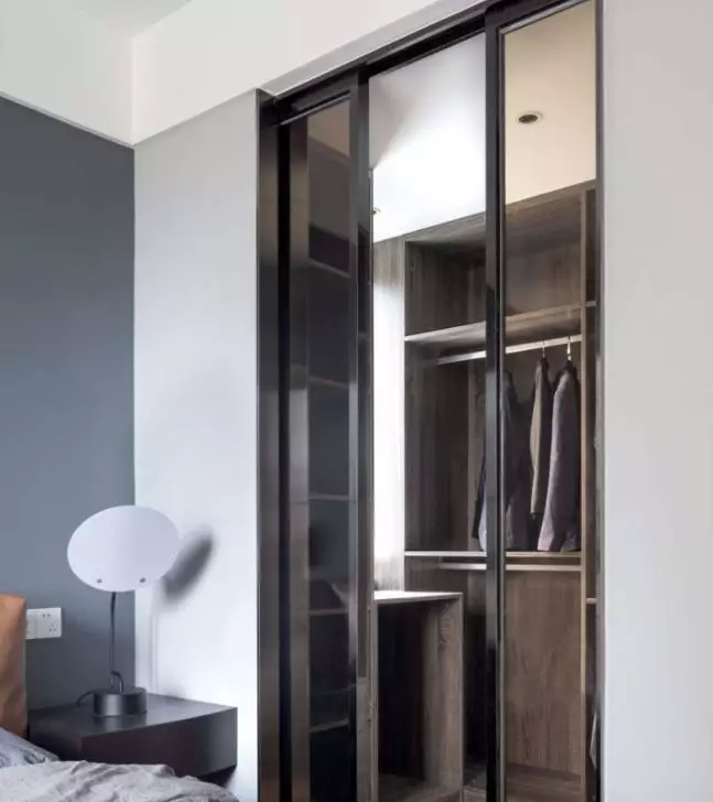 或者是先设计一面大衣柜,然后再加多一扇玻璃推拉门,这样也能得到一个很不错的衣帽间。只不过这样的衣帽间,在功能上跟普通的大衣柜差别不大。