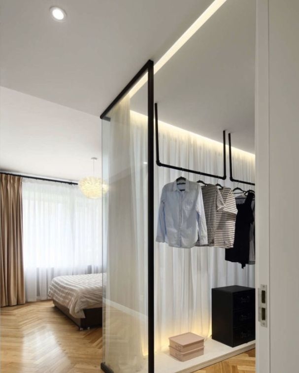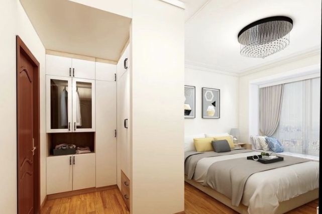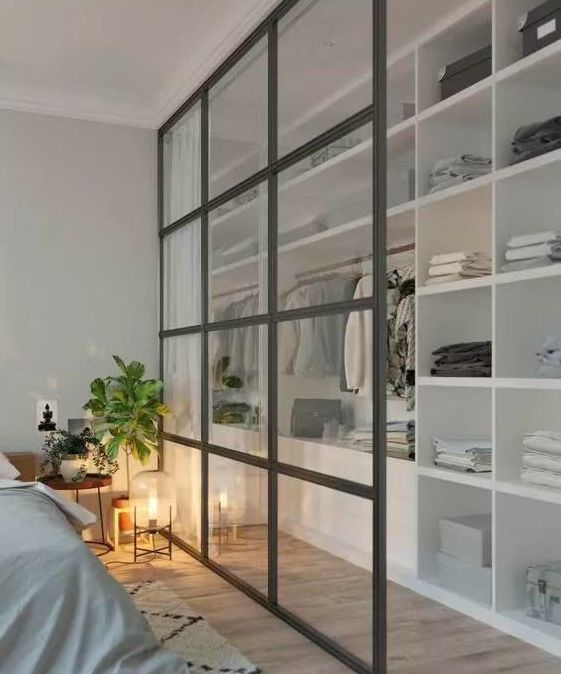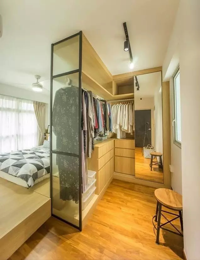 如果卧室户型很方正,进门后的旁边没有墙体阻隔,那还可以用玻璃隔断隔出一个衣帽间。