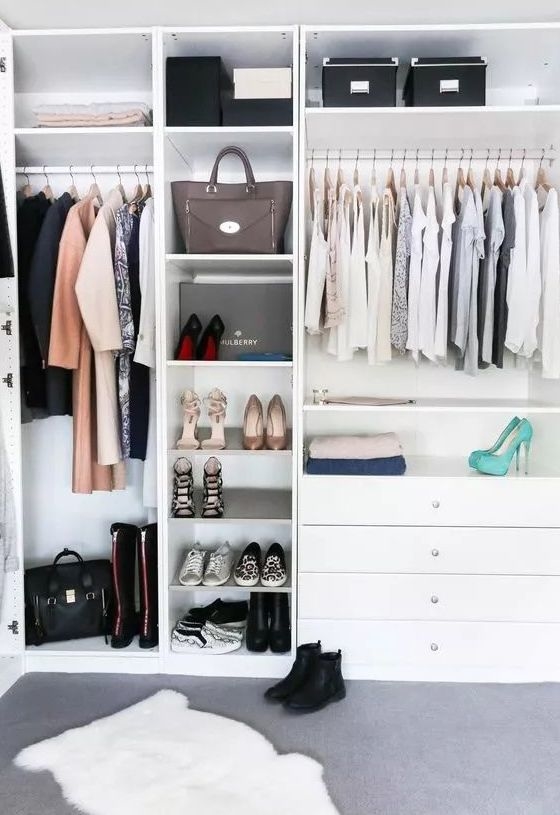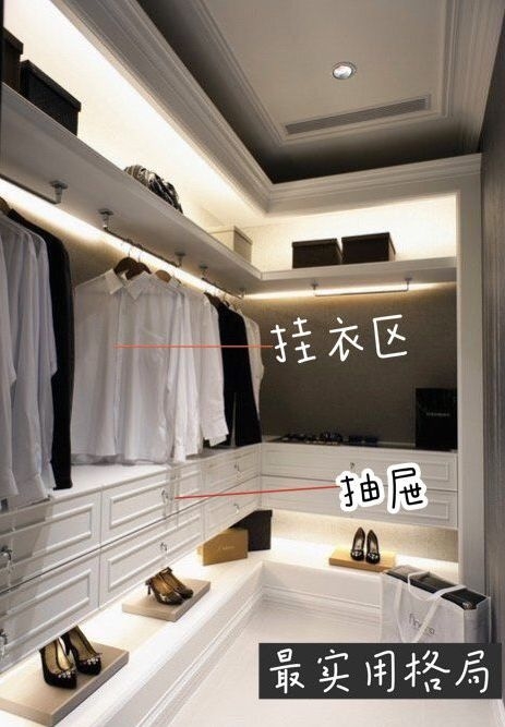 衣帽间内部最实用的格局就是“上挂下抽”,即上面挂衣区,下面抽屉区。最顶部的空间的话就放一些换季的被子之类。