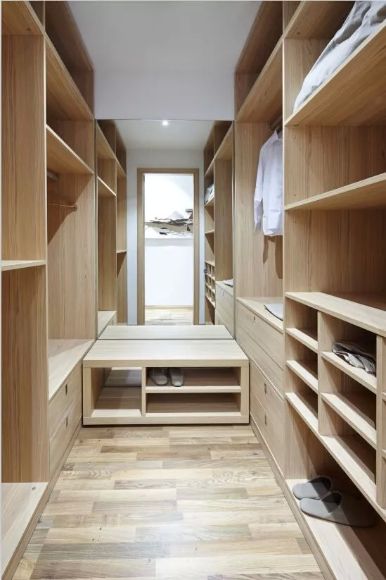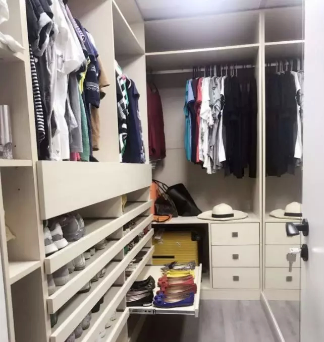 衣帽间的内部布局一定要做收纳分区。像下图的案例,业主鞋子很多,所以下面一排有专门的鞋子收纳抽屉,上方主要用来挂衣服,然后大行李箱收纳在转角处。