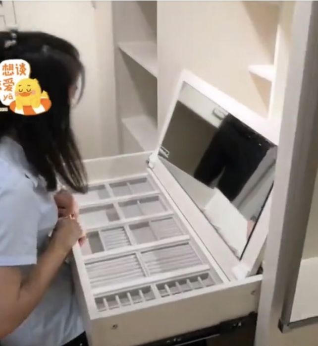 如果是小户型,衣帽间面积不大,那可以不用单独留出一个梳妆台,换成下图这种伸缩的抽屉型梳妆台。