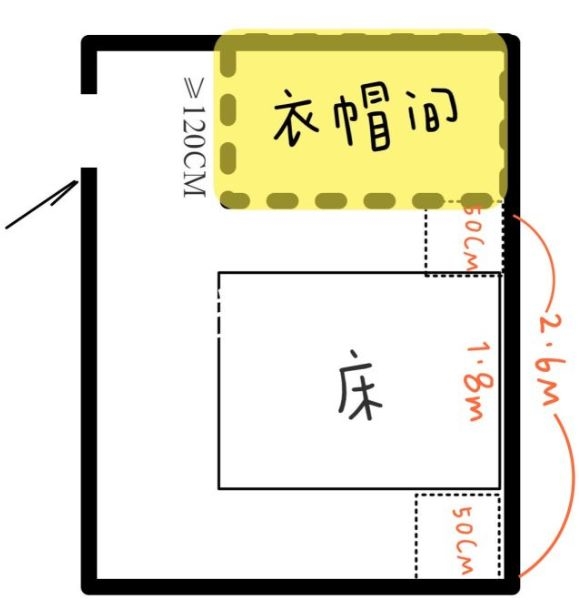 如下图,只要卧室床头旁边有120cm以上的空间,都能设计一个衣帽间。