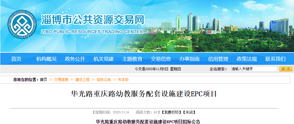 近日,淄博市公共资源交易网发布华光路重庆路幼教服务配套设施建设EPC项目招标公告。