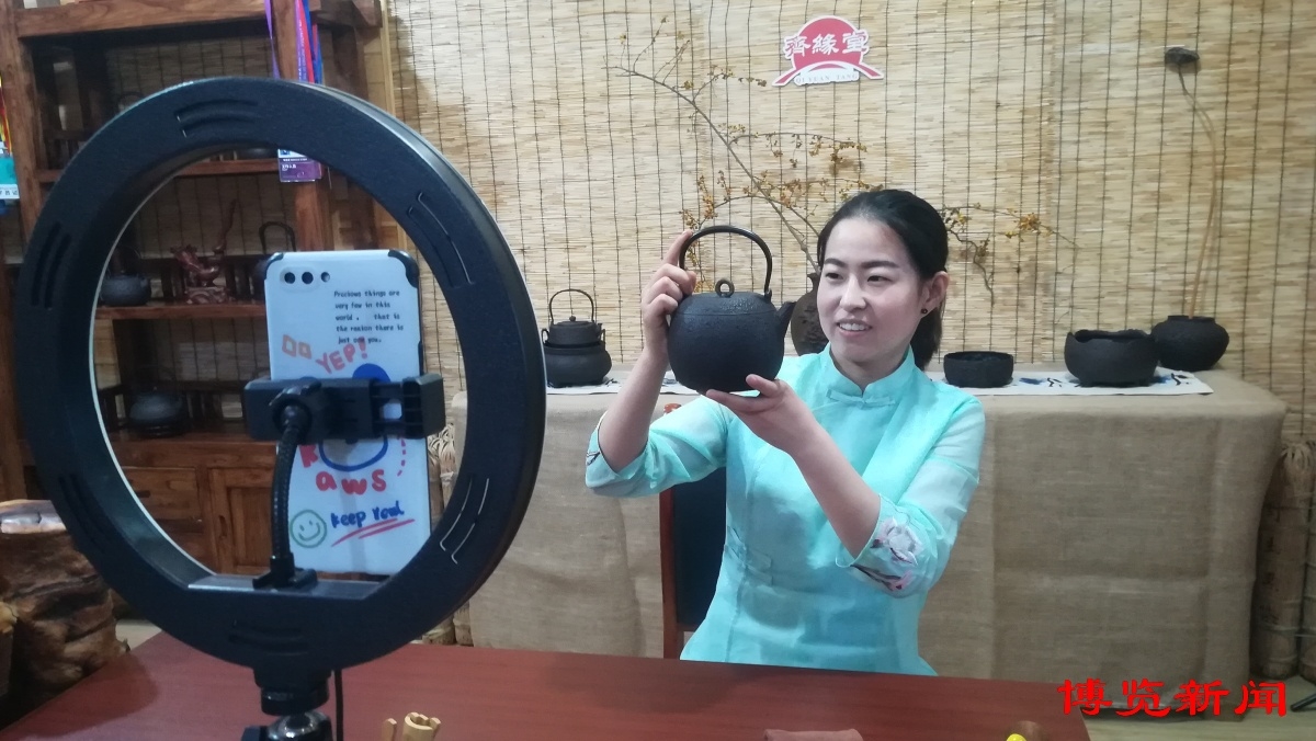 淄川龙泉铁壶制作技艺是山东省级非物质文化遗产,数十年来,在传承的基础上不断在器型等方面进行创新,成为集实用、观赏、收藏为一体“山东手造”品牌,产品不仅国内市场覆盖率持续提升,还远销20多个国家和地区。图为“90”后龙泉铁壶制作工匠邱娇娇直播介绍铁壶煮水喝的益处。