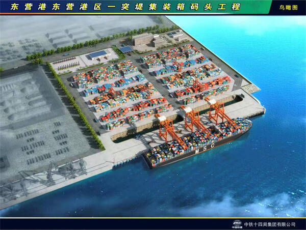 东营港集装箱码头岸线长度420米,暂设5万吨级集装箱泊位1个,按照靠泊10万吨级集装箱船舶设计建设,可兼顾同时靠泊2艘2万吨级集装箱船,设计年运量30万标准箱。工程包含水工结构、堆场码头,候工楼、辅建区变电所、供水调节站、海关查验库、集疏港闸口、危废库等辅助建设。
