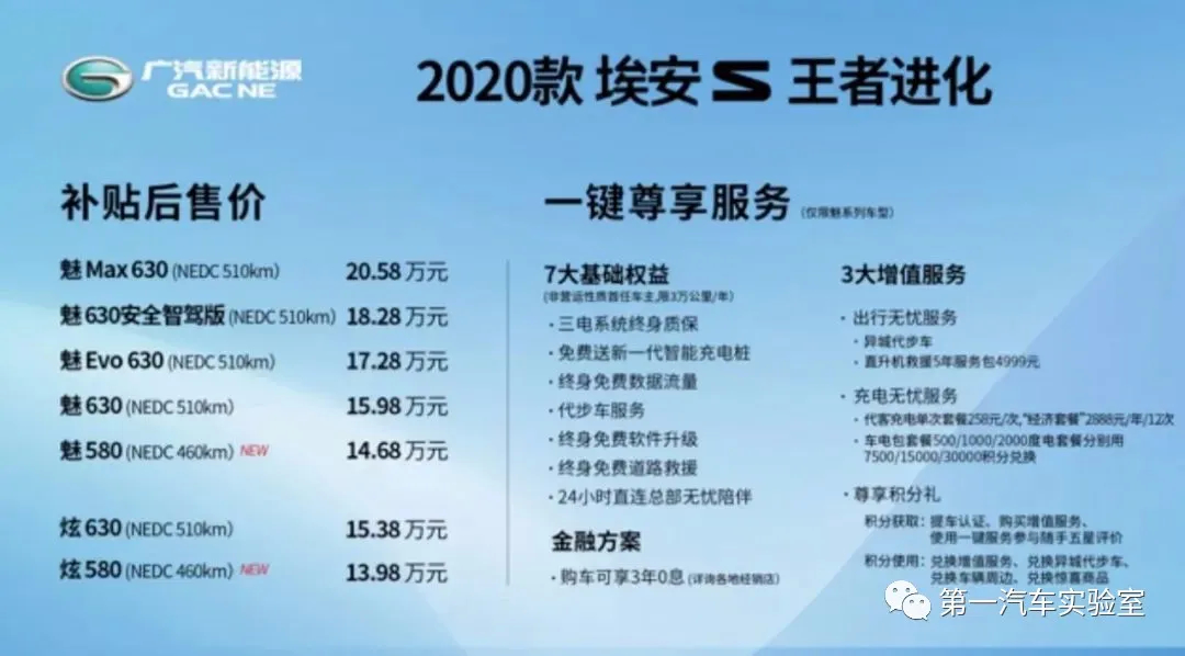 在实现续航进化、科技进化、服务进化的全面升级后,2020款埃安S的补贴后售价依然维持在13.98万元起,做到“加量不加价”,为用户带来先人一步的科技享受,让用户体验到真正的实惠。