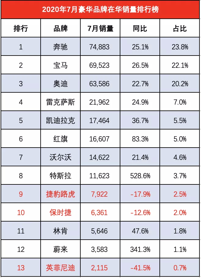虽说7月豪华品牌普遍实现同比增长,但仍有处于“悲观”的豪华品牌出现在合资及进口豪华品牌,当月销量表现不及自主品牌,下滑迹象明显。
