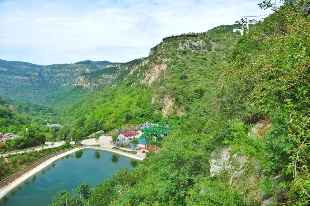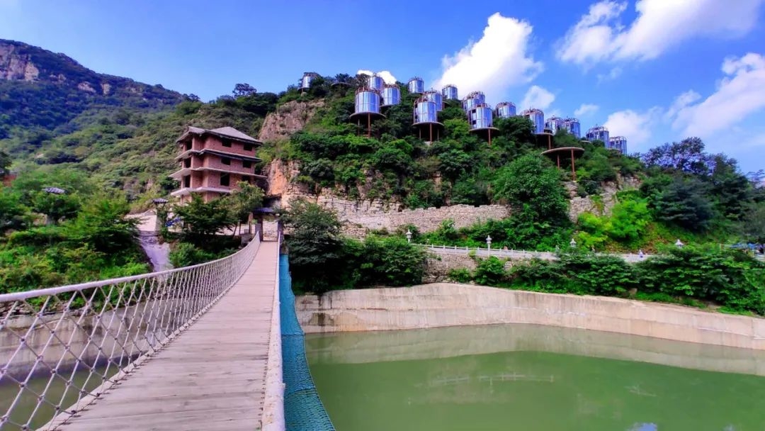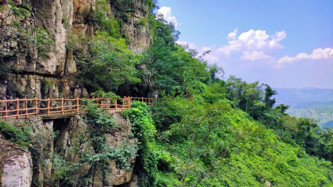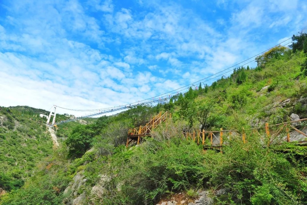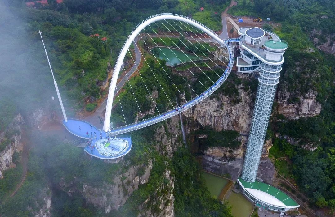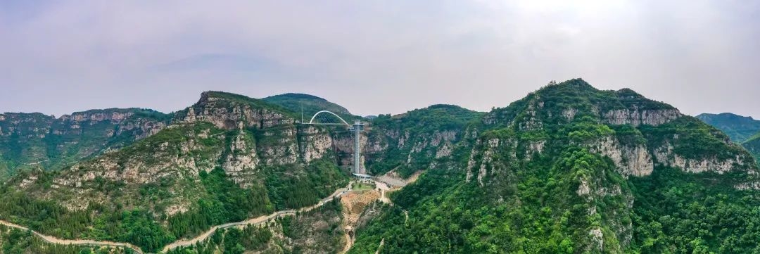 有世界首座无背索斜拉玻璃桥,站在桥上可以俯瞰脚底的瀑布,体验“云端行走”的刺激,站在山顶瞭望台,远看脚下盘山路和远处群峰,豁然有一种“太行天路”的既视感。