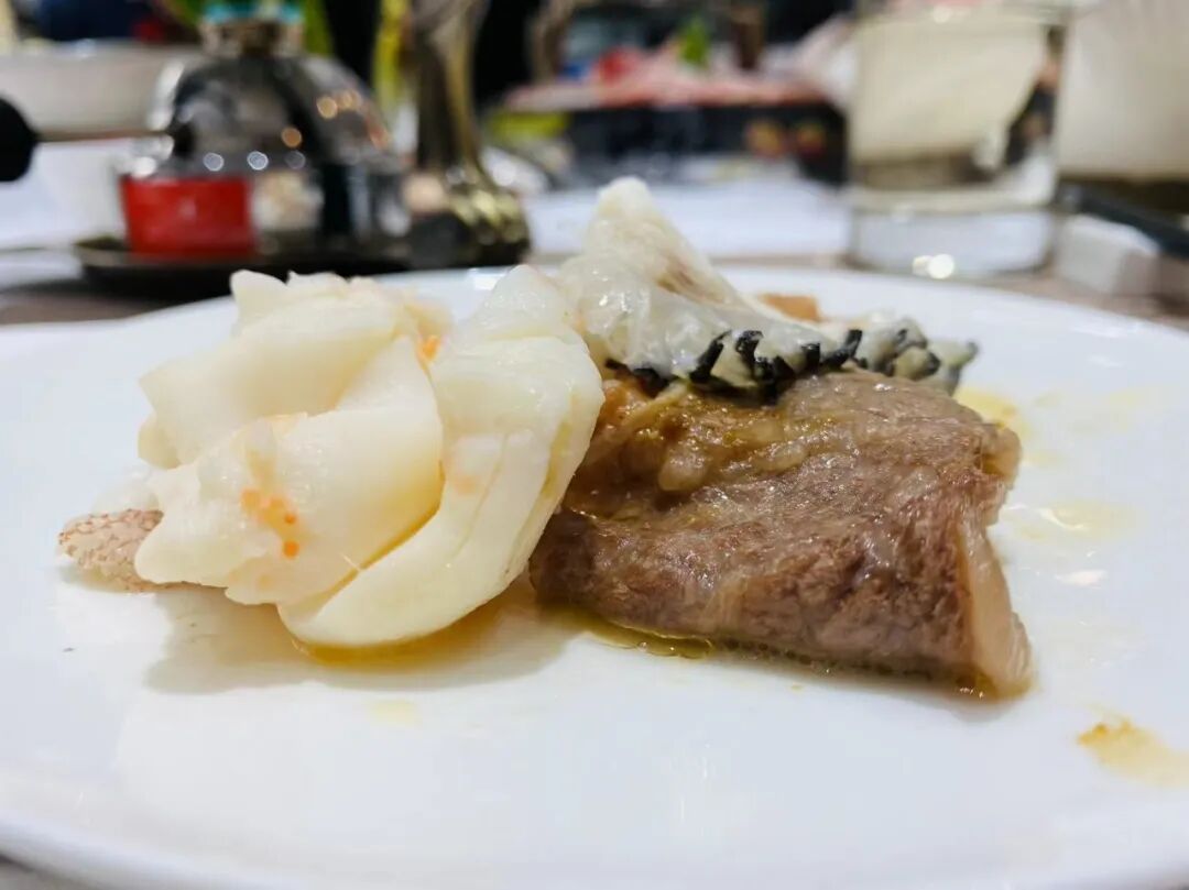 今天选了很多平时不太见到的比较好的食材,海钓的东星斑肉质非常细腻紧实,涮八秒钟瞬间变成奶白色,入口非常滑嫩,还有点甜。花龙涮八秒钟,龙虾的肉比鱼肉更弹一些,更有嚼劲,海钓的龙趸鱼肉比较弹牙,涮起来十秒就可以吃,弹弹的肉,脆脆的皮。澳洲雪花牛肉是5A的,搭配沙茶酱是绝配。