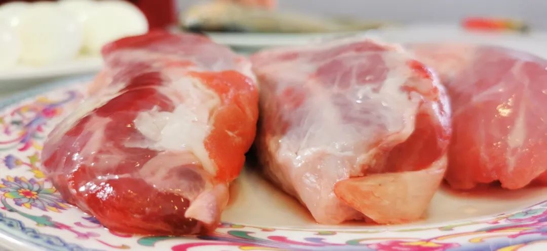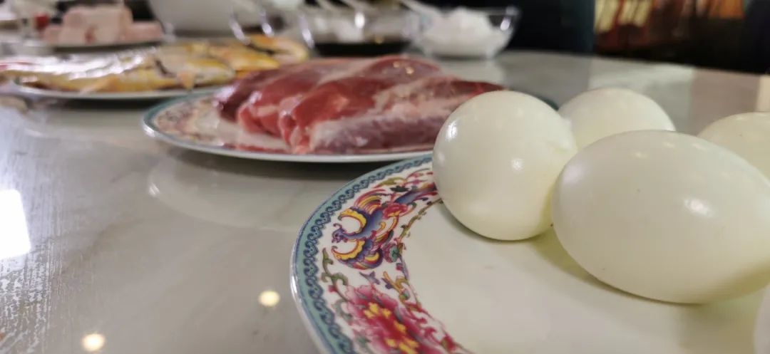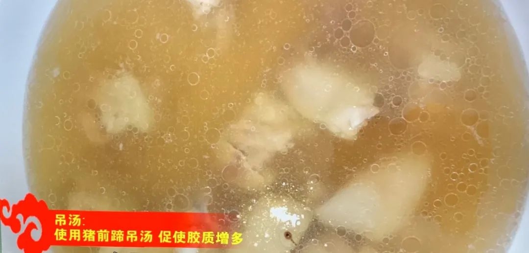 五花肉煮熟之后要用竹签在上面扎上孔,煮熟的鸡蛋炸成虎皮蛋,主要的食材必须要经过油炸,烧锅里面加热的时候不至于烧烂 。主要的调料是黄酒,做烧锅有三大主料六小调料,还有一个主要的技法就是预先吊汤,烧锅的汤主要是用猪蹄来吊,今天选的猪前蹄,肉比较饱满胶质也丰富。