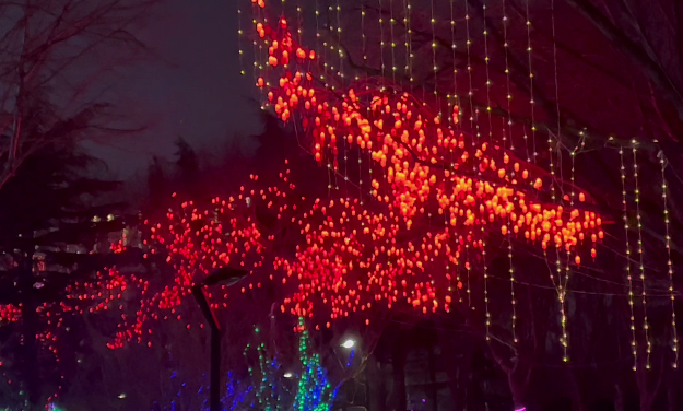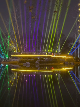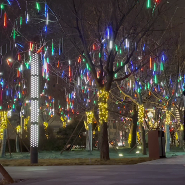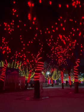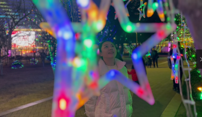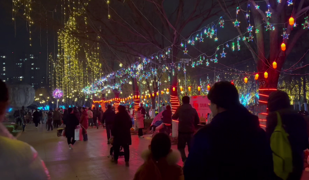 走进夜晚的人民公园,人群热闹熙攘,抬头可见树冠上挂满晶亮的雪花瓣和星星,色彩缤纷的成串氛围灯与远处的高楼霓虹灯相映成趣,不少市民带着家人和孩子驻足观赏、拍照留念,尽显团圆团聚的春节氛围。